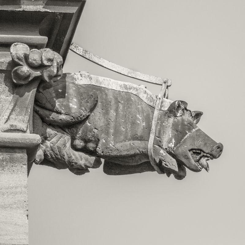 Related to the depiction of the so-called 'Judensau' in the choir stalls, this gargoyle takes the form of a pig crouching on its hind legs. A man, identifiable as a Jew from the conical hat on his head, is suckling on the sow's teats. This motif was widely used in architectural sculpture from the thirteenth century onwards. About 30 of these caricatures are known to exist on churches and other public buildings, especially in the German-speaking world.