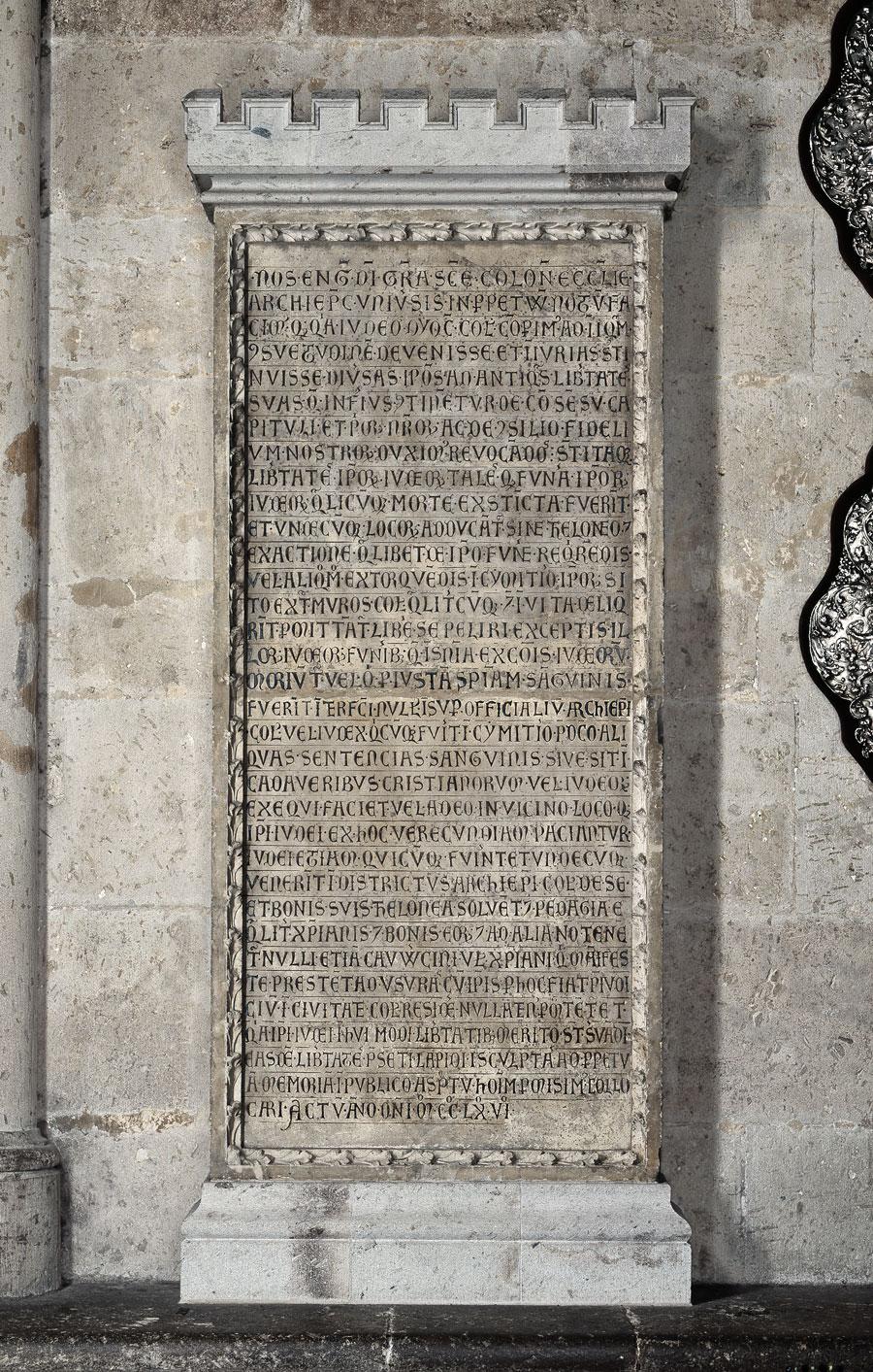 The imposing epigraph, which is over two metres in height, is made out of two slabs of French limestone. Cologne Cathedral's Jewish privilege is a rare example of a stone charter of the kind that otherwise generally takes the form of a sealed parchment document.