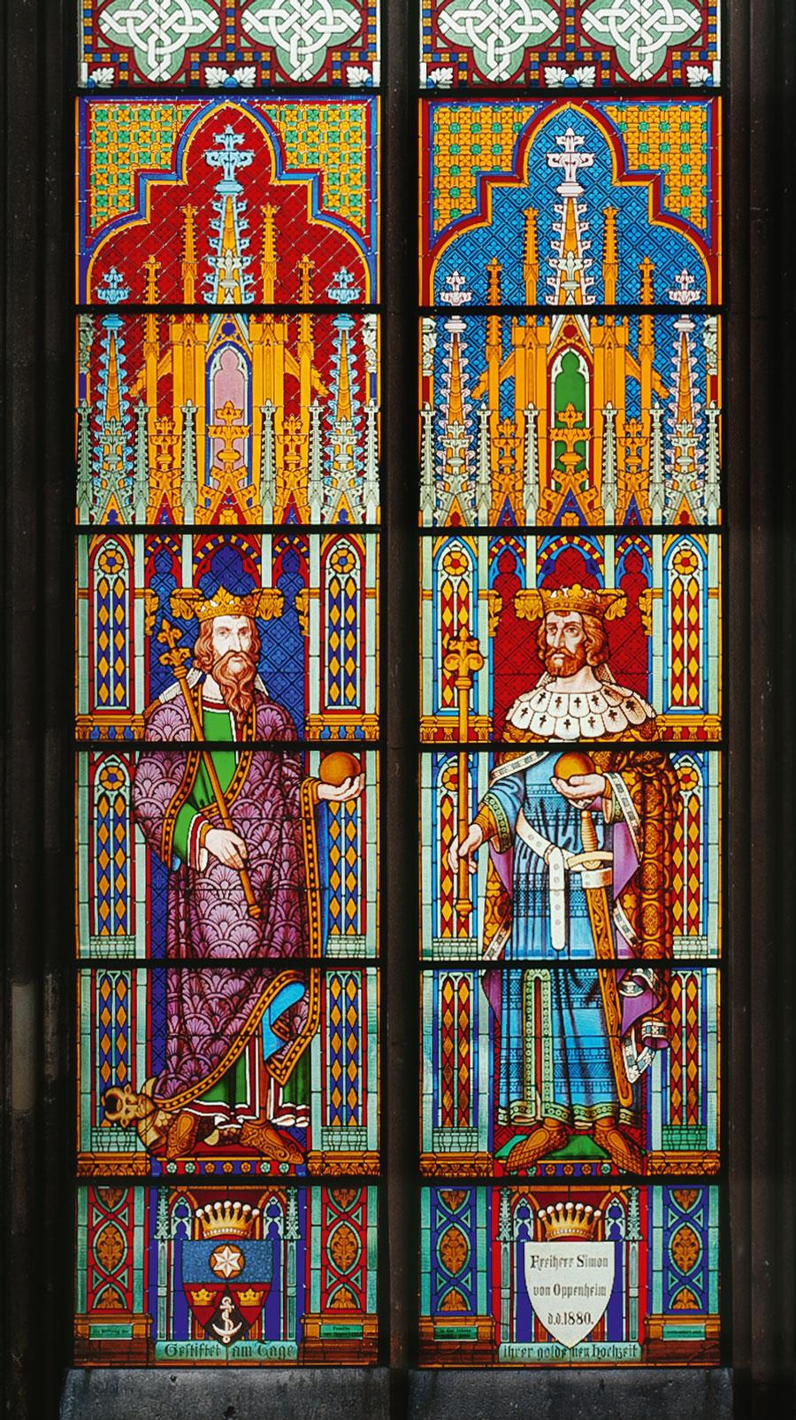This explains why Jewish citizens contributed financially to its completion from 1842 onwards. The Oppenheims, a Jewish banking family, in particular gave considerable sums of money towards the completion of the cathedral and donated several items for it. Four windows alone bear the name 'Oppenheim'. These windows all feature—as might be expected for a donation from a Jewish family—figures from the Old Testament. Simon von Oppenheim (1803–1880) and his wife Henriette Obermayer (1812–1885) celebrated their golden wedding anniversary in the year the cathedral was completed (1880). To mark the occasion, they donated a large four-lancet window to the cathedral. The figures in the window were designed by glass painter Michael Welter. The first two lancets show the Old Testament kings Josiah and Jehoshaphat, each beneath a baldachin and above a shield. On one of the shields is the coat of arms of the Oppenheim family; in the other the words 'Baron Simon von Oppenheim, dated 1880'. Texts beneath the coats of arms explain the reason for the donation. The coat of arms and name of Henriette Obermayer appear in other two lancets and include, among other figures, King Solomon, who gave the entire window its name.