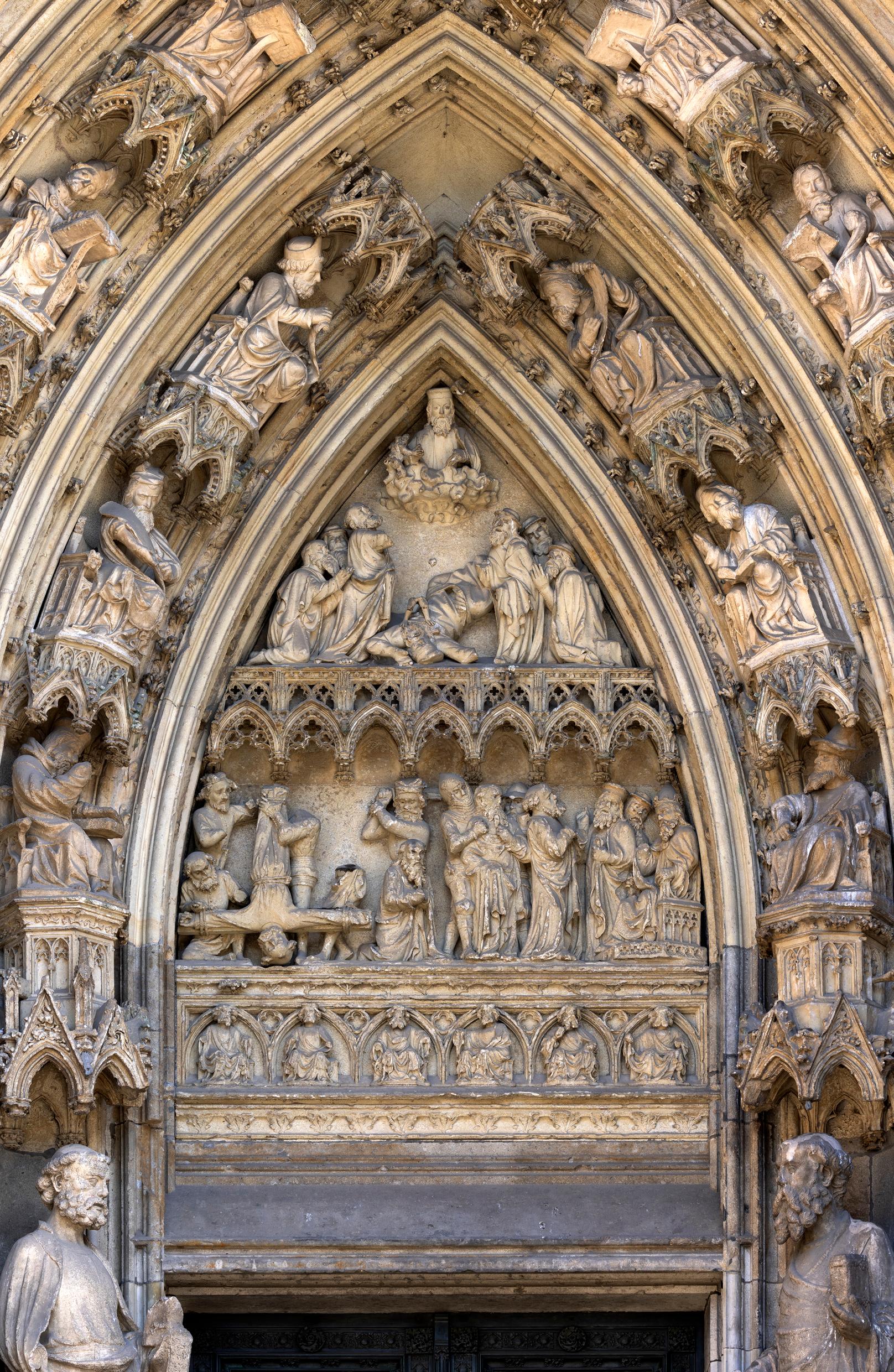 The tympanum of the St Peter portal, which dates from sometime around 1378–1381, shows three scenes from the legend of the Apostles Peter and Paul. The story begins in the bottom right-hand corner with the disputation before Nero between St Peter and Simon Magus (Simon the Sorcerer), a magician mentioned in the Acts of the Apostles (Acts 8: 9–25).