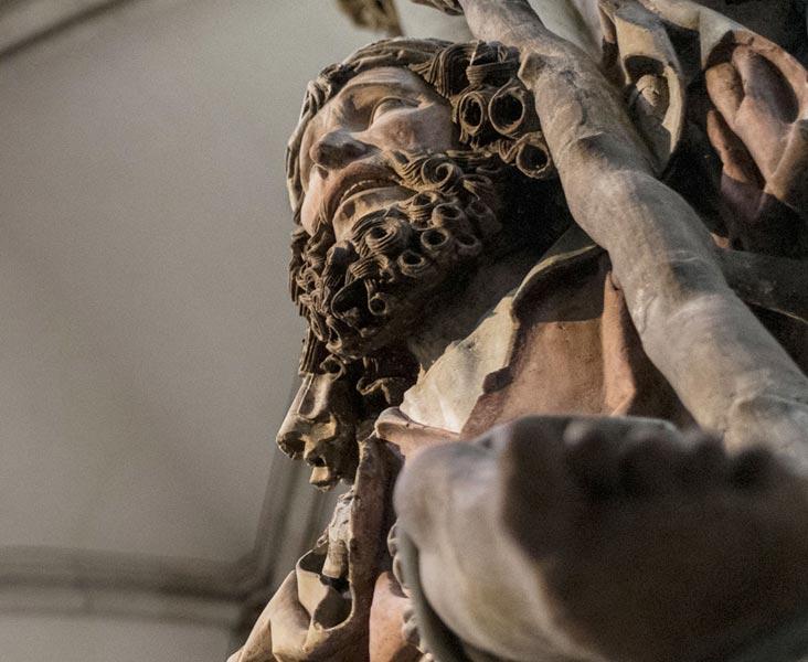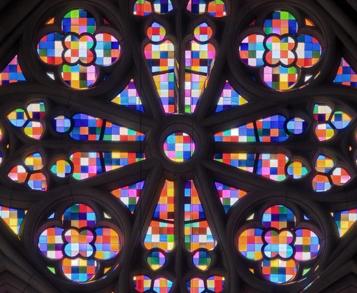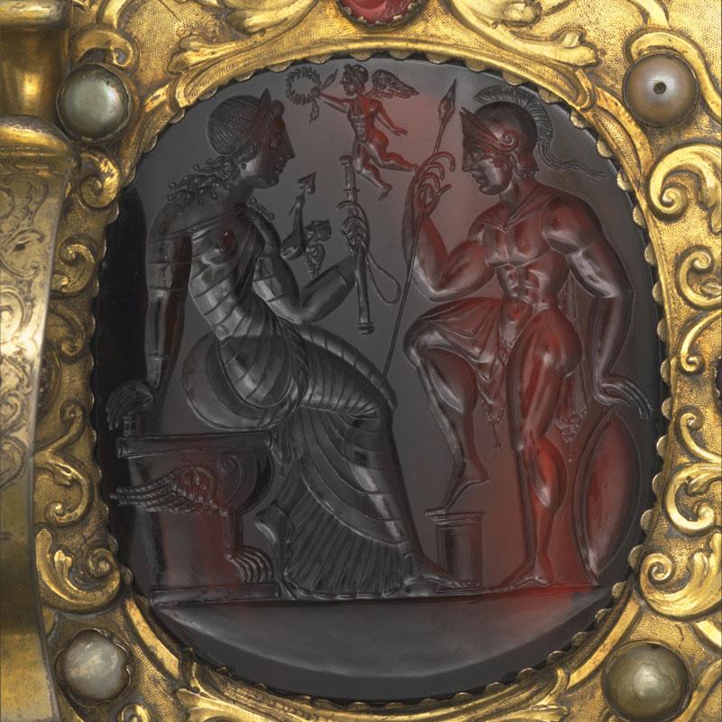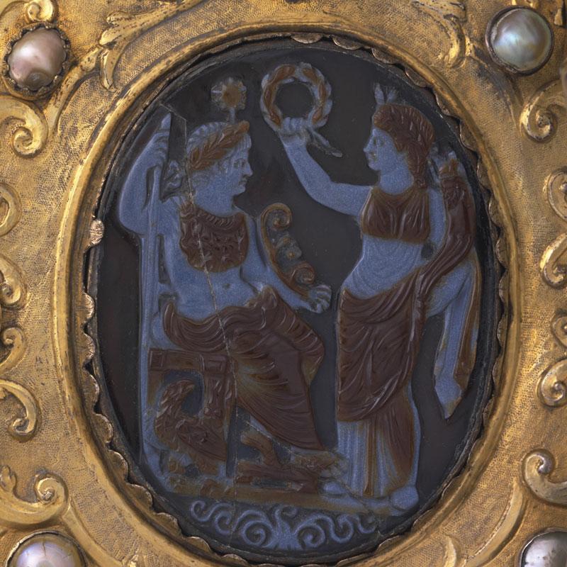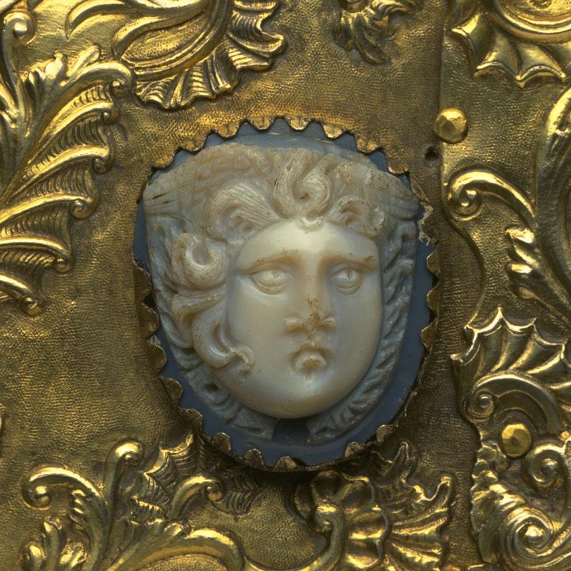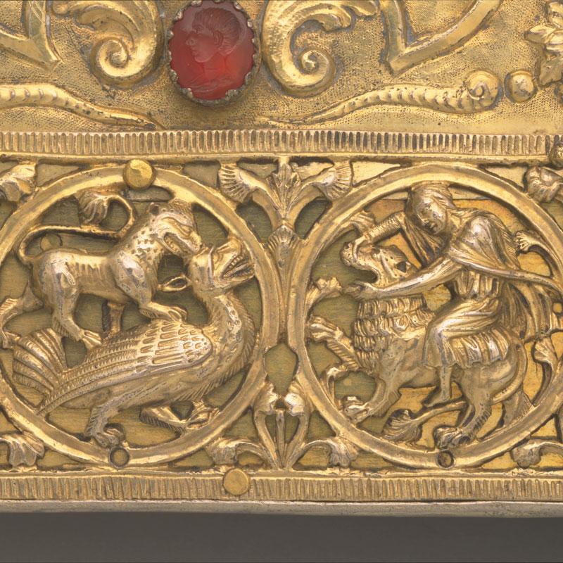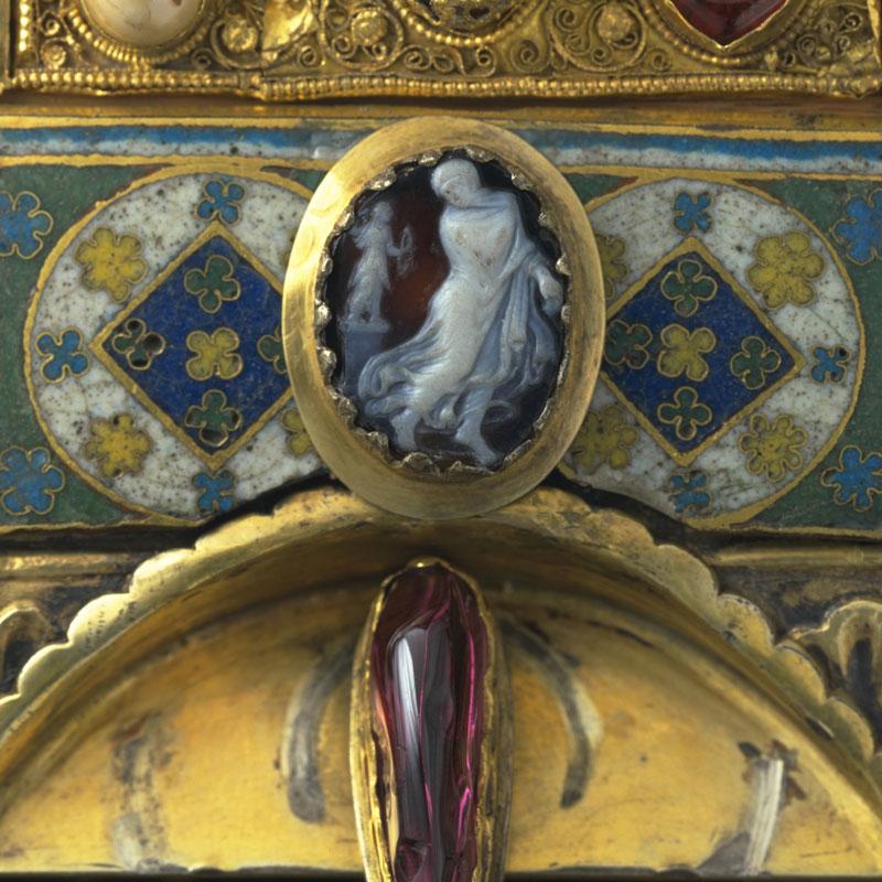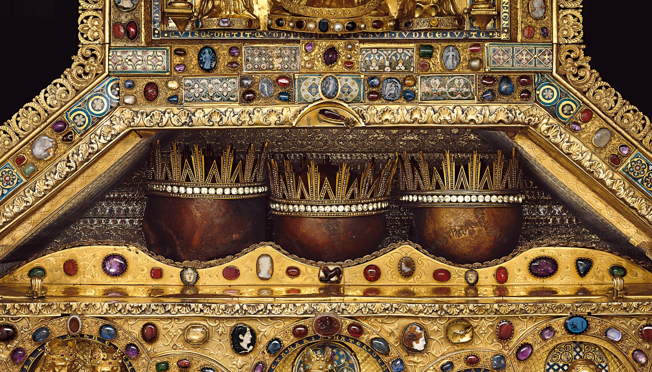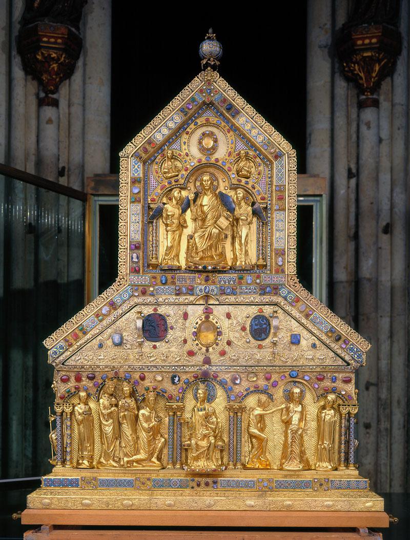 Hier sind auch die größten und kostbarsten antiken Gemmen und Kameen versammelt. Als Fortsetzung eines heute verlorenen Reliefzyklus zum Leben Christi auf den Dachflächen der Langseiten zeigen die Reliefs an der Front die Anbetung der Könige, die Taufe Christi und Christus als Weltenrichter. Die Trapezplatte zwischen oberer und unterer Zone ist abnehmbar. Hinter einem Gitter werden die Schädel der Könige sichtbar. Sie konnten so nicht nur den Pilgern gezeigt werden, sondern es wurden auch kleine Gebetszettelchen aus Stoff oder Papier, oft mit einer Darstellung der Heiligen Drei Könige, mit Hilfe einer Zange an die Schädel gehalten. Als Berührungsreliquien wurden sie an die Wallfahrer gegeben, die so zeigen konnten, dass sie nach Köln gepilgert waren.