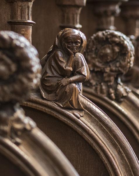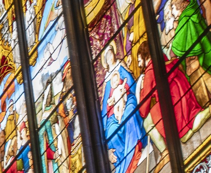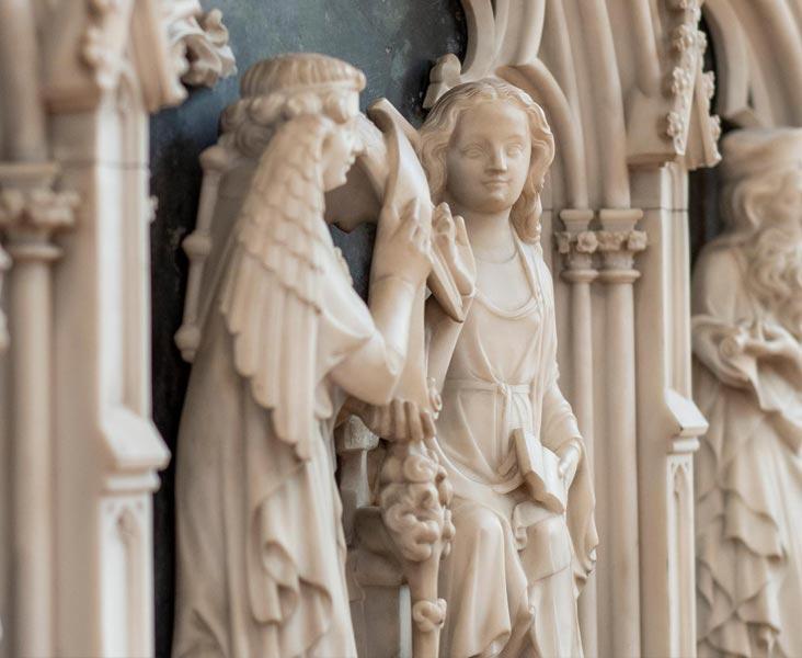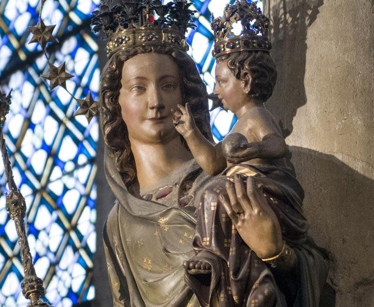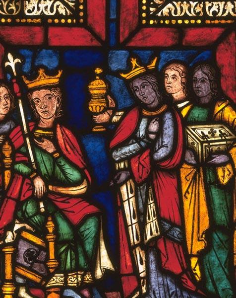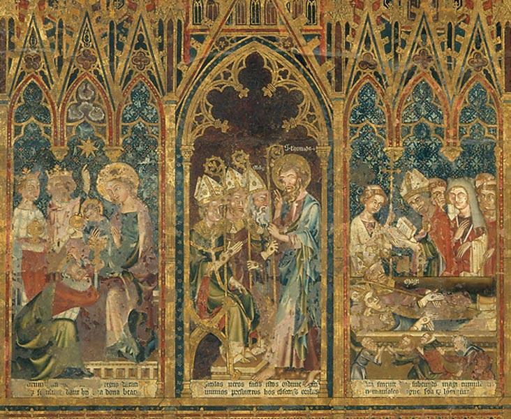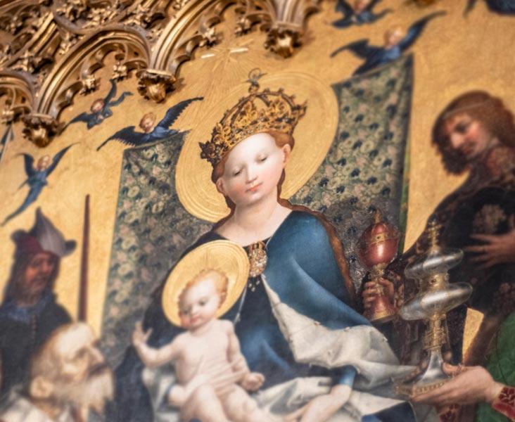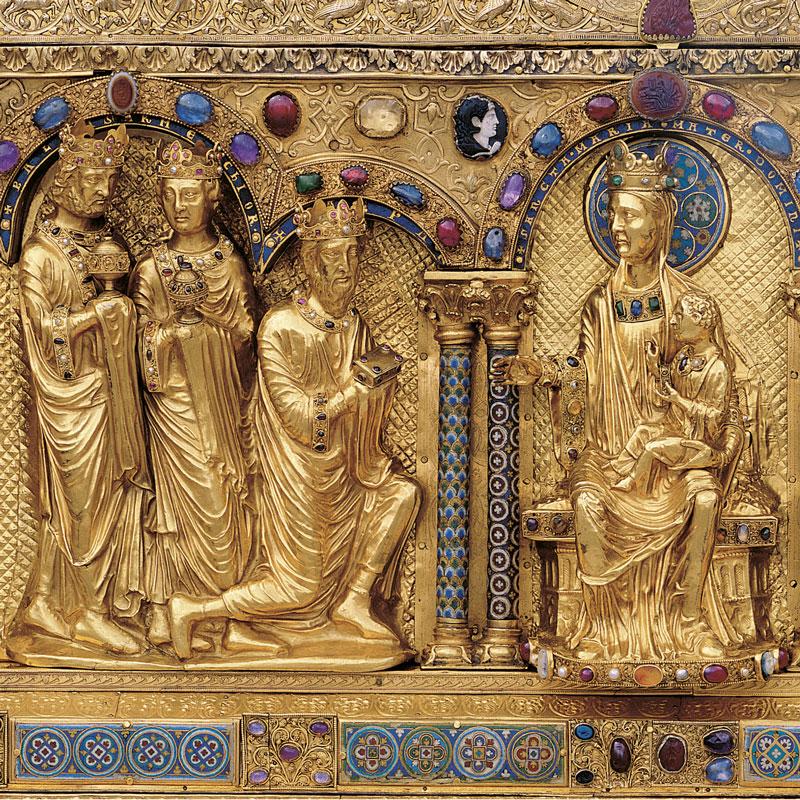 Die Szene ist am Schrein der einzige Hinweis auf die Reliquien, die er enthält. Maria mit dem Jesuskind thront feierlich in einer eigenen Arkade, von links nähern sich die Heiligen Drei Könige mit ihren Geschenken. Der Älteste an der Spitze beugt schon das Knie. Das Relief unterscheidet sich stilistisch von den um 1190 entstandenen Propheten der Langseite, die mit dem Goldschmied Nikolaus von Verdun verbunden werden können. Es wurde von einer Nachfolgewerkstatt geschaffen.