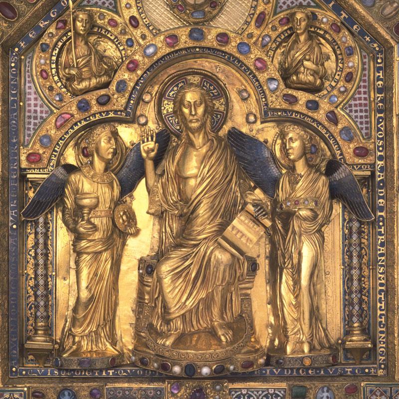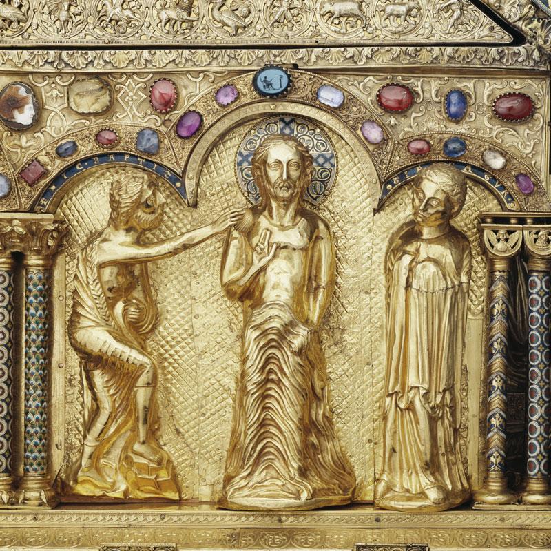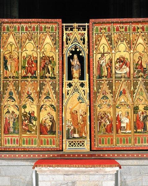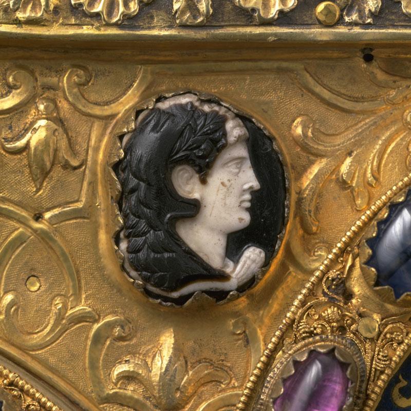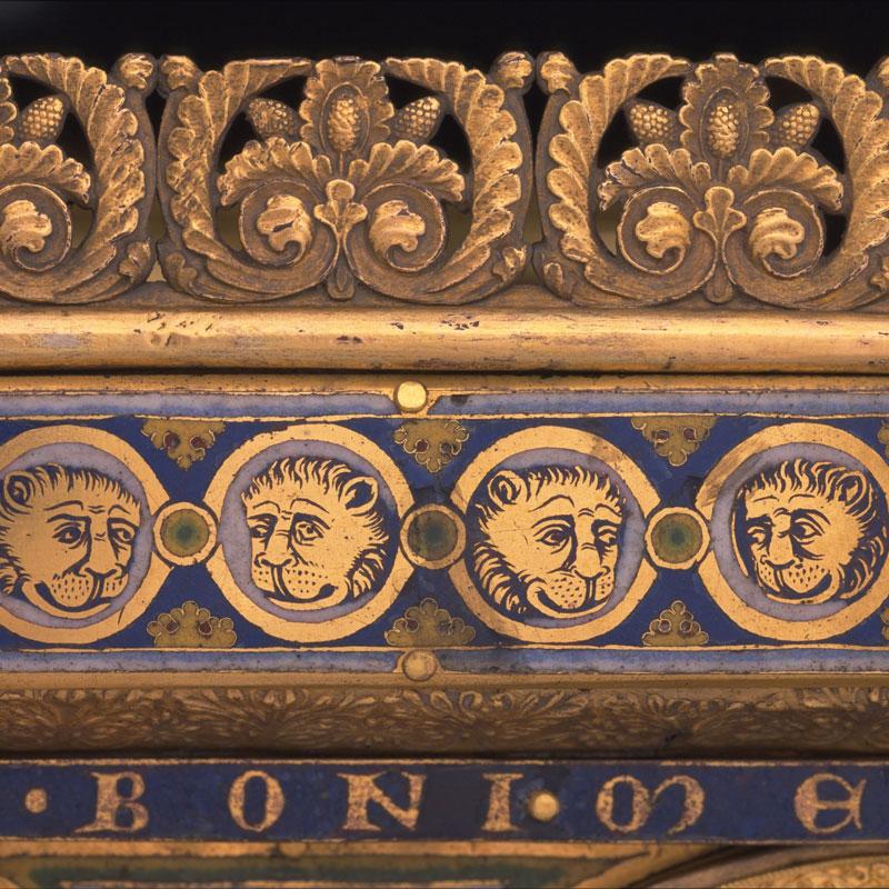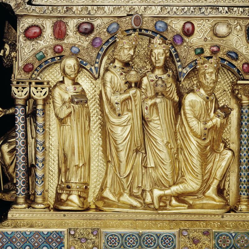 Die Vorderseite des Schreines wurde um 1200 von König Otto IV. gestiftet. Sie ist als einzige aus reinem Gold gefertigt.