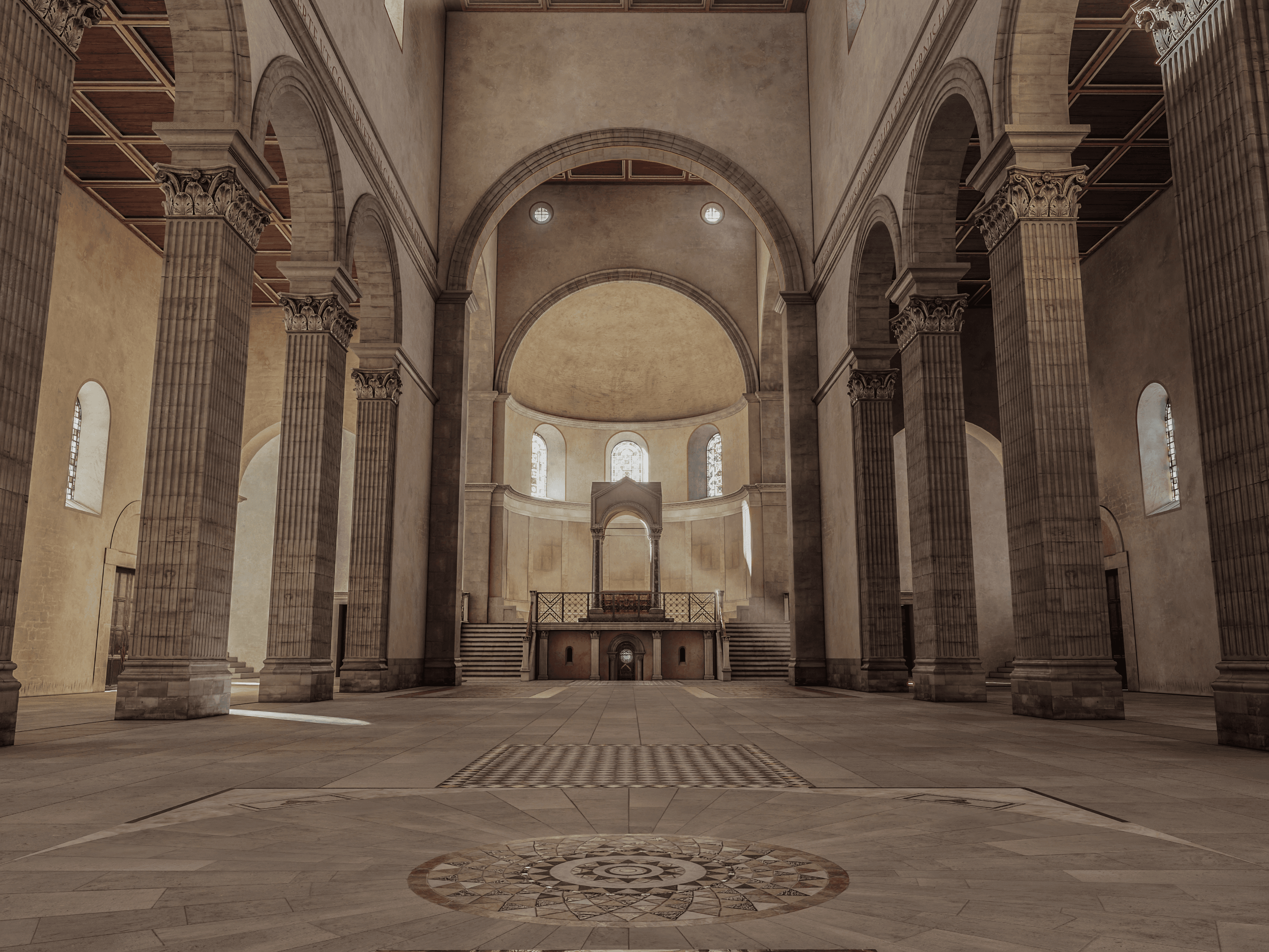 In der Vogelperspektive erschließt sich der ganze Formenreichtum des Hildebold-Domes, der schon im detailreich und prachtvoll gestalteten, insgesamt rund 2500 Quadratmeter großen Fußboden beginnt.