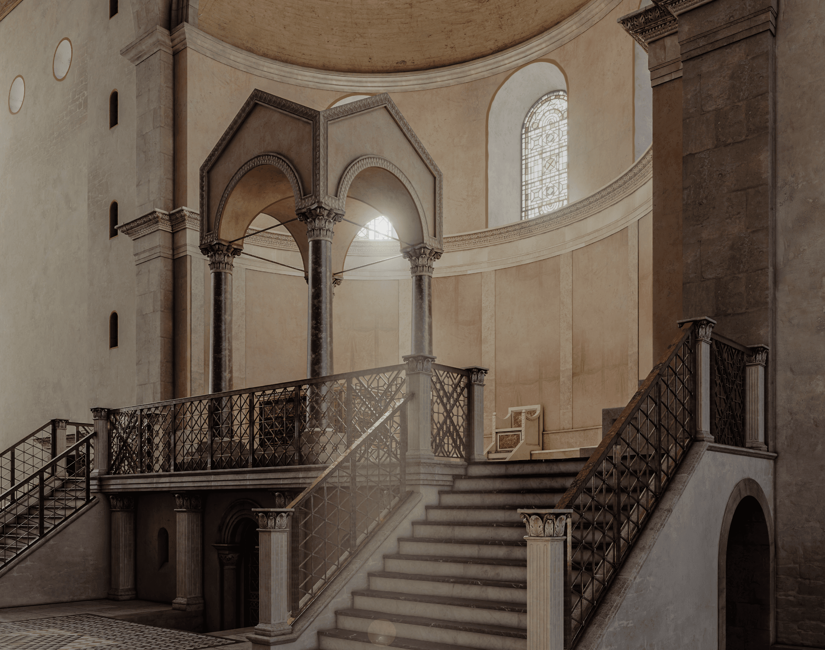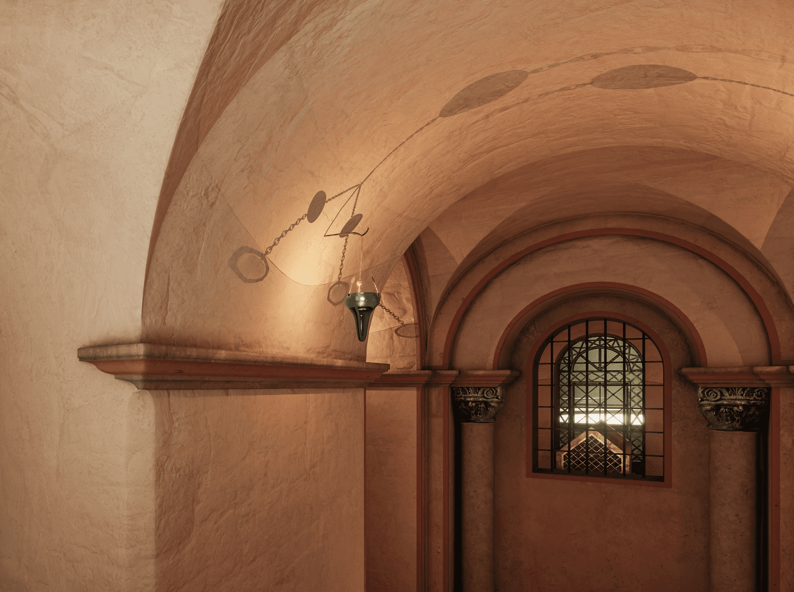 Die kostbare Ausgestaltung setzt sich vom Fußboden nach oben fort: in der Innengliederung mit der antikisierenden Bauzier, dem goldumkleideten Petrusaltar sowie den – hier nicht abgebildeten – Leuchterkronen, farbigen Bleiglasfenstern und den kassettierten Holzbohlenbalkendecken.