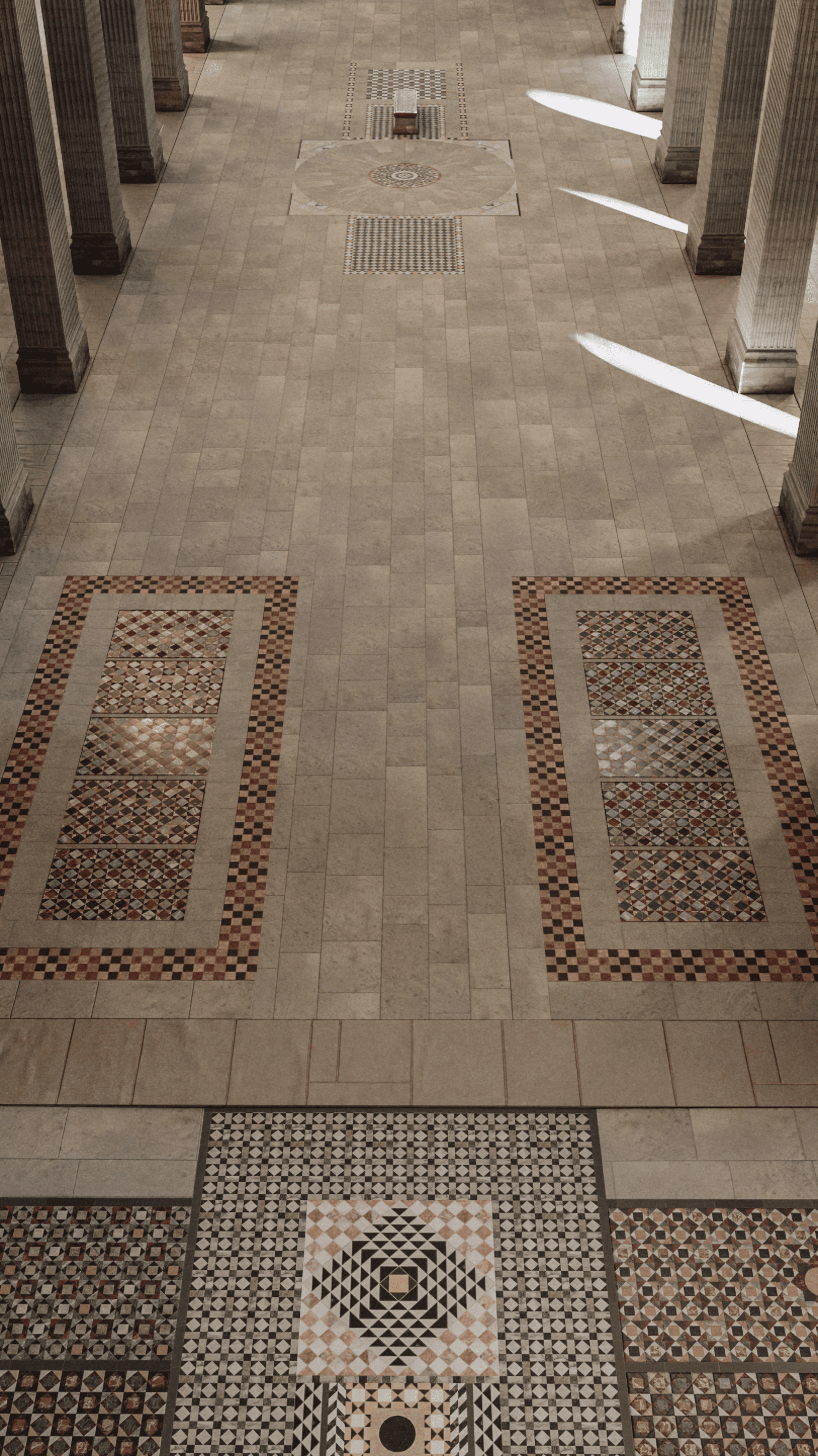 Neben größeren Abschnitten aus großformatigen hellen Drachenfels-Trachytplatten weist der Fußboden zahlreiche kleinteilige Ornamentfelder auf, die an steingewordene Orientteppiche erinnern und als aufwendige Plattenmosaike ausgeführt sind. Dabei wird jedes Plättchen mit nach unten abgeschrägten Seiten versehen, um diese möglichst ohne sichtbare Fugen direkt in den frischen Mörtelboden verlegen zu können. Die große Variantenvielfalt der einzelnen Musterflächen wird dabei durch den Materialwechsel der Steinplättchen und der damit verbundenen farblichen Veränderung erreicht, aber auch durch eine variierende Formgebung und Anordnung der Marmorplättchen.