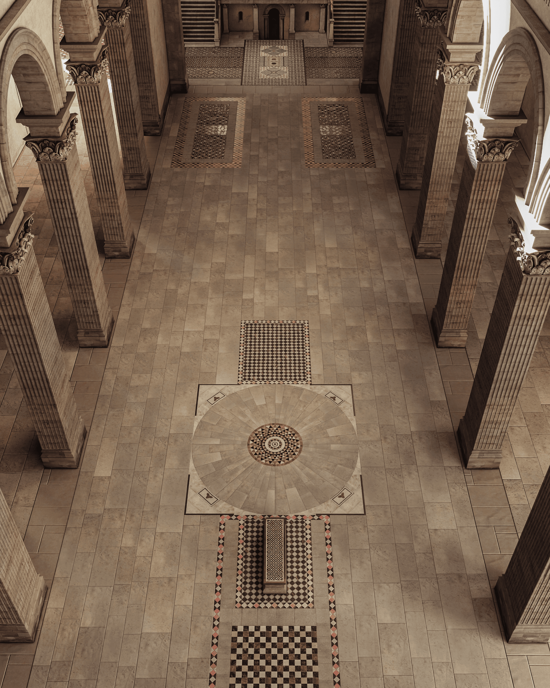 Das zentrale Kreisornament im Schmuckfußboden markiert den Mittelpunkt der doppelchörigen Kirche. Das Innere der Mittelrosette wird von einem kunstvollen Opus-sectile-Plattenmosaik gebildet, das aus unterschiedlichsten Einzelformen und Marmormaterialien besteht, und deren Plättchen nahezu fugenlos verlegt zu sein scheinen.