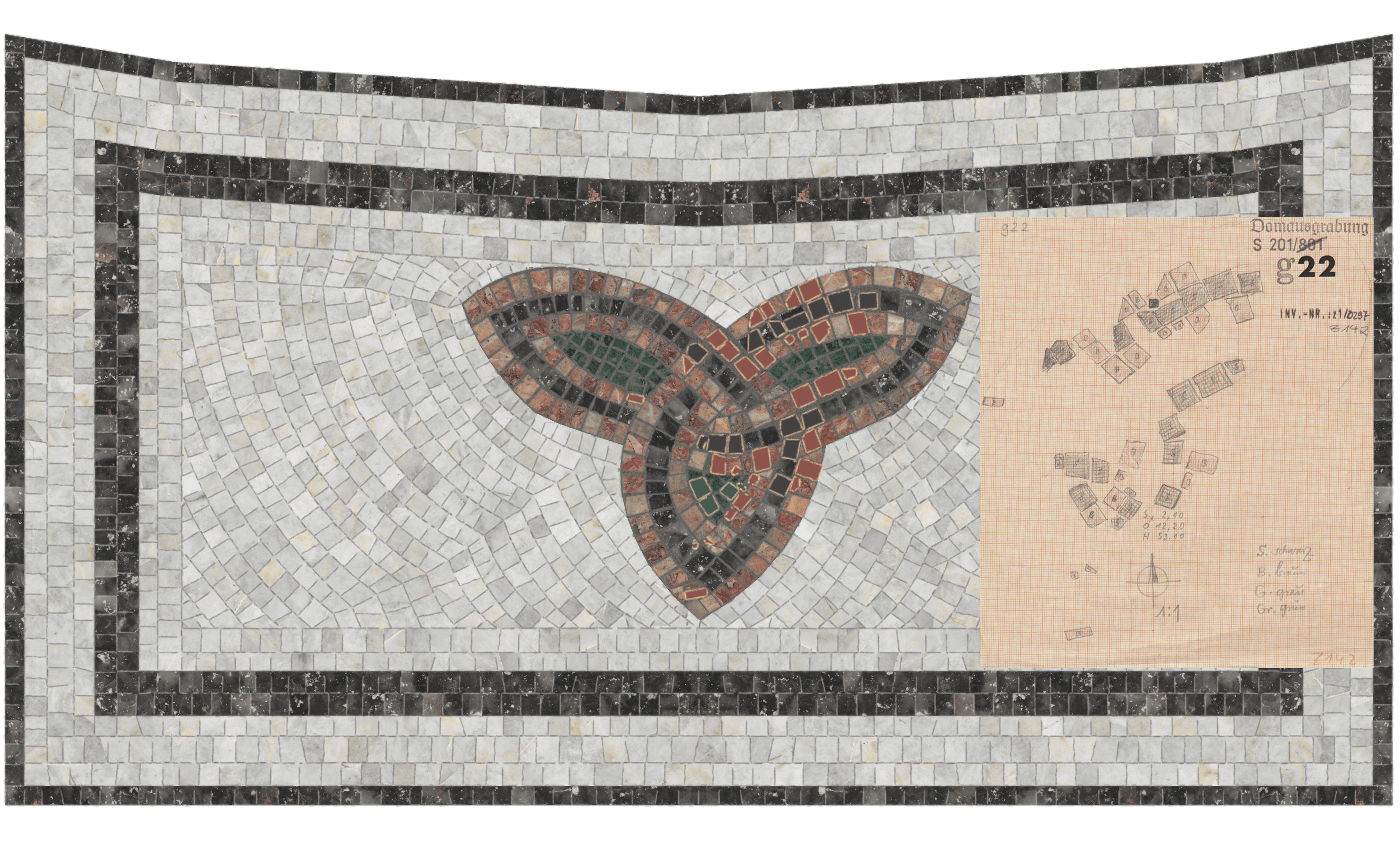 Die Rekonstruktionen der Fußbodenmuster wurden mit dem Befund sowie den Grabungsdokumentationen größtmöglich abgeglichen. Die zeichnerisch erfassten marmornen Mosaiksteine des Dreierknotens in den Zwickelflächen des Mittelkreises wurden originalgetreu in die Rekonstruktion übernommen. Dabei wurden sämtliche Farben und Steinpositionen berücksichtigt. Die in der Grabungszeichnung abgebildeten Mosaiksteine sind in der Rekonstruktion gelb umrissen.