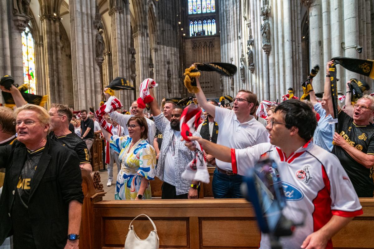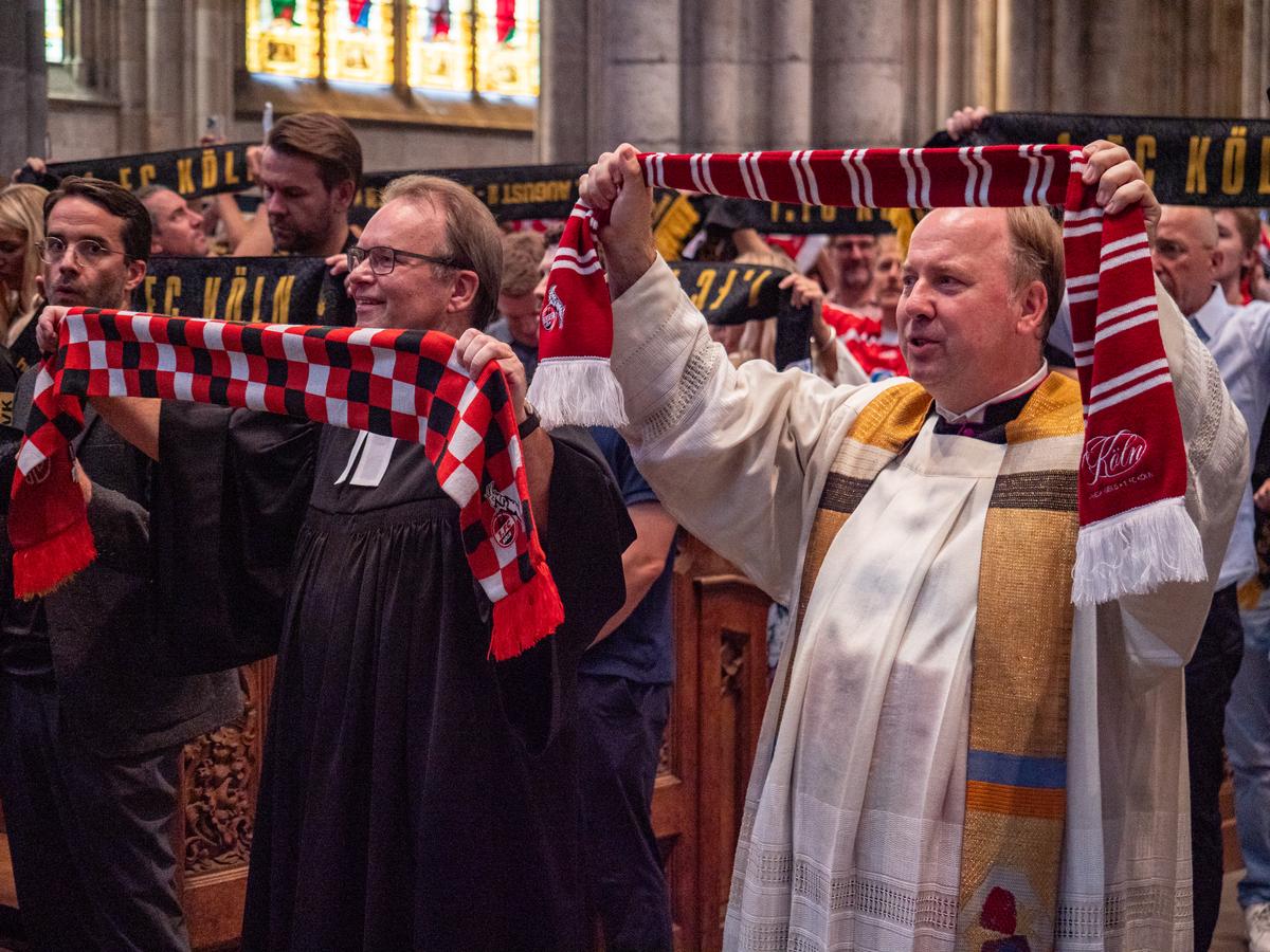 Passend zum Doppeljubiläum von Dom und FC war es eine Andacht mit vielen Überraschungen. Gleich beim Eintritt in den Dom erhielten alle Fans als Geschenk einen Fanschal, der dem besonderen Jubiläum Rechnung trägt und sich in seiner Gestaltung an das neue Ausweichtrikot des 1. FC Köln anlehnt. Die Fürbitten wurden u.a. von Pierre Littbarski und Stadionsprecher Michael Trippel vorgetragen.