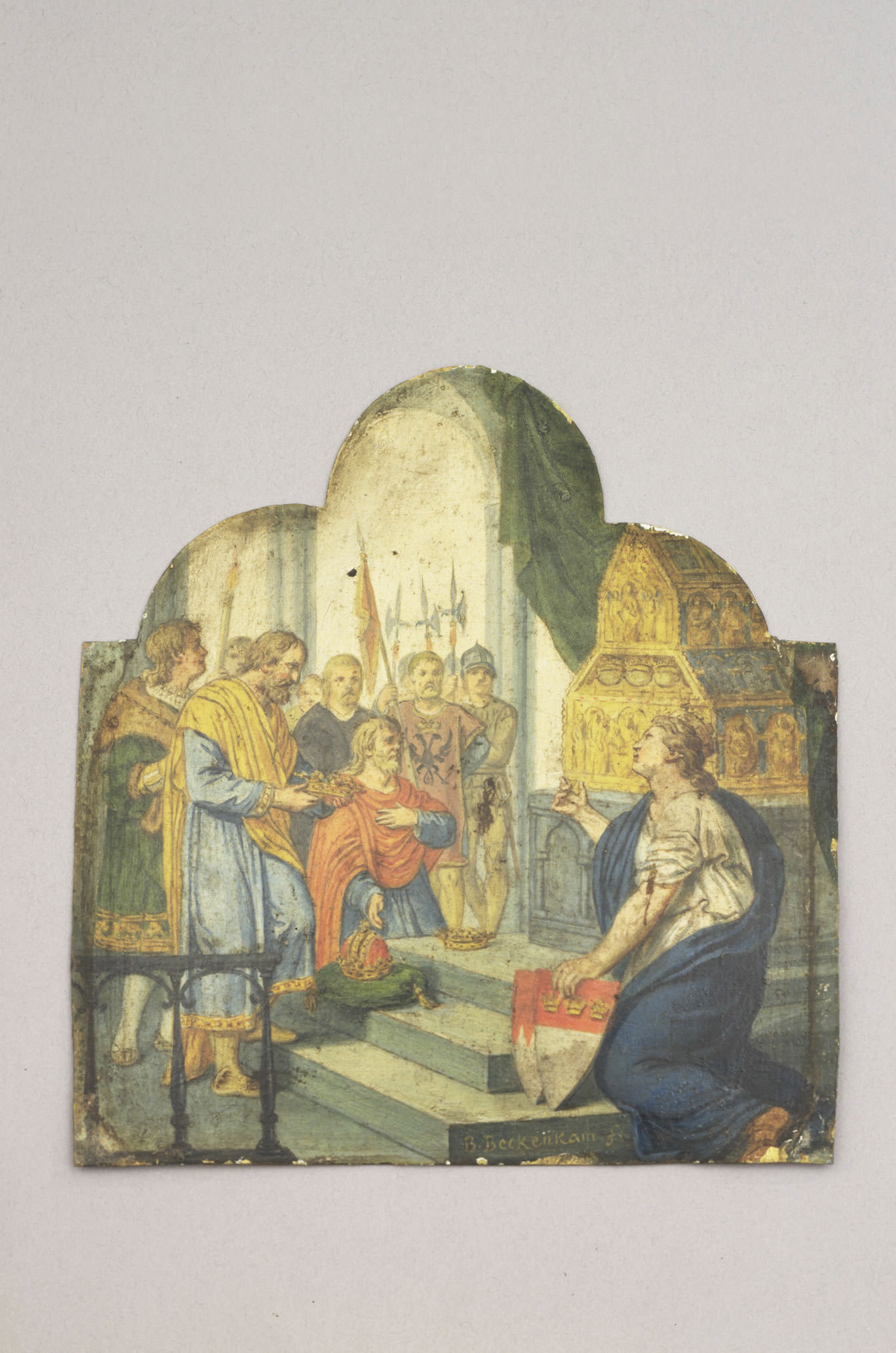 Hohe Domkirche Köln, Dombauhütte, W. Kralisch: Dreikönigenschrein, mittelalterlicher Holzkern, Davidseite: Die Heiligen Drei Könige predigen den Völkern; Dreikönigenschrein, mittelalterlicher Holzkern, Davidseite: Verehrung der Reliquien durch Könige