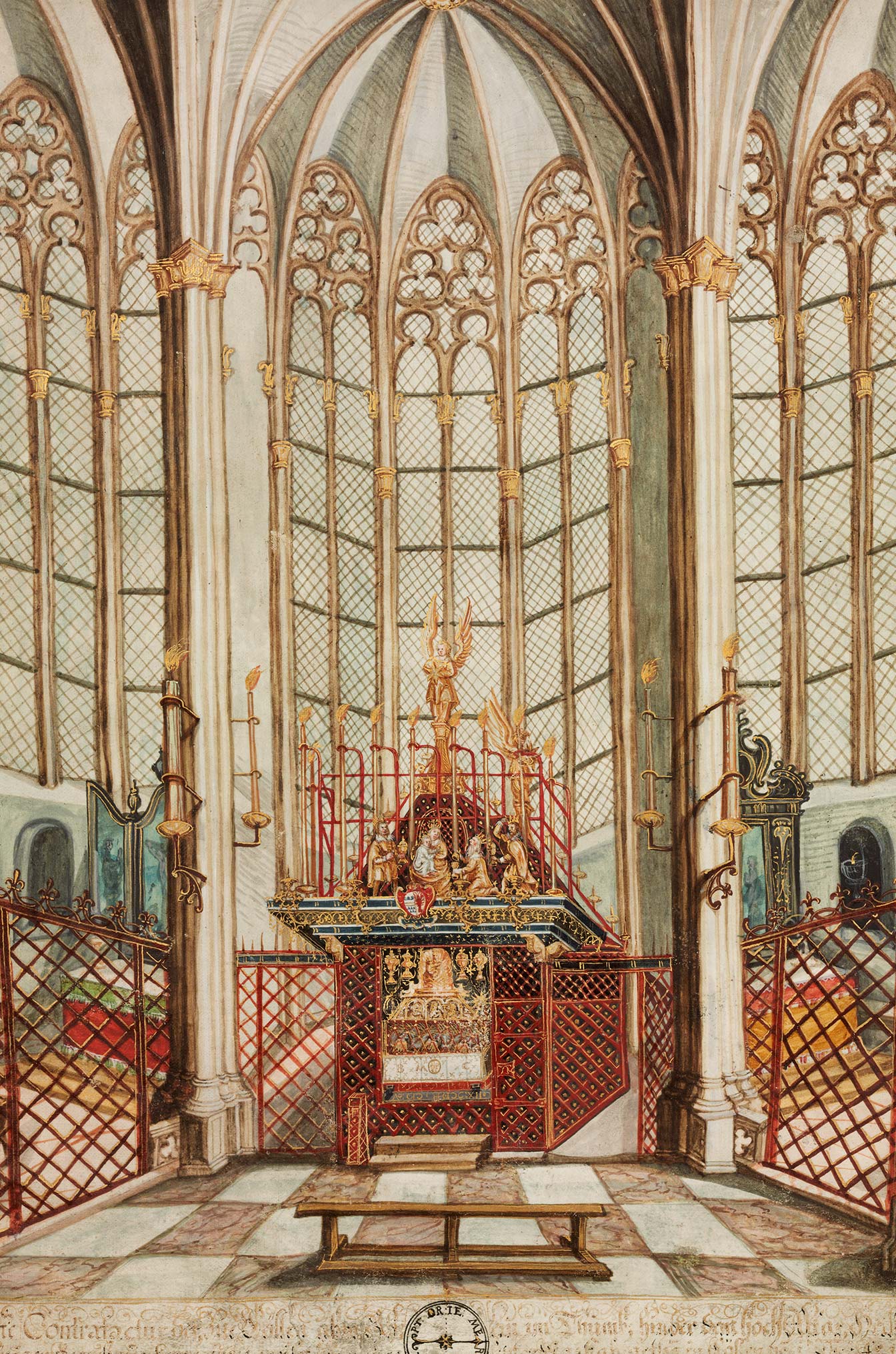 Im mittelalterlichen Gittergehäuse hingen, wie später auch im barocken Dreikönigenmausoleum, zahlreiche wertvolle Weihegaben, die im Laufe der Jahrhunderte den Heiligen Drei Königen geschenkt wurden. Keine hat sich erhalten. Die meisten wurden in der Folge der Französischen Revolution eingeschmolzen. Über sie berichtet der englische Reisende Thomas Coryat im 17. Jahrhundert:
