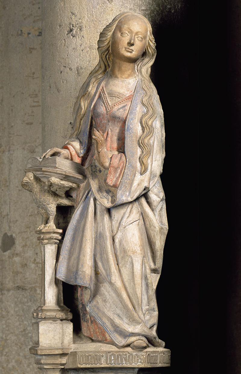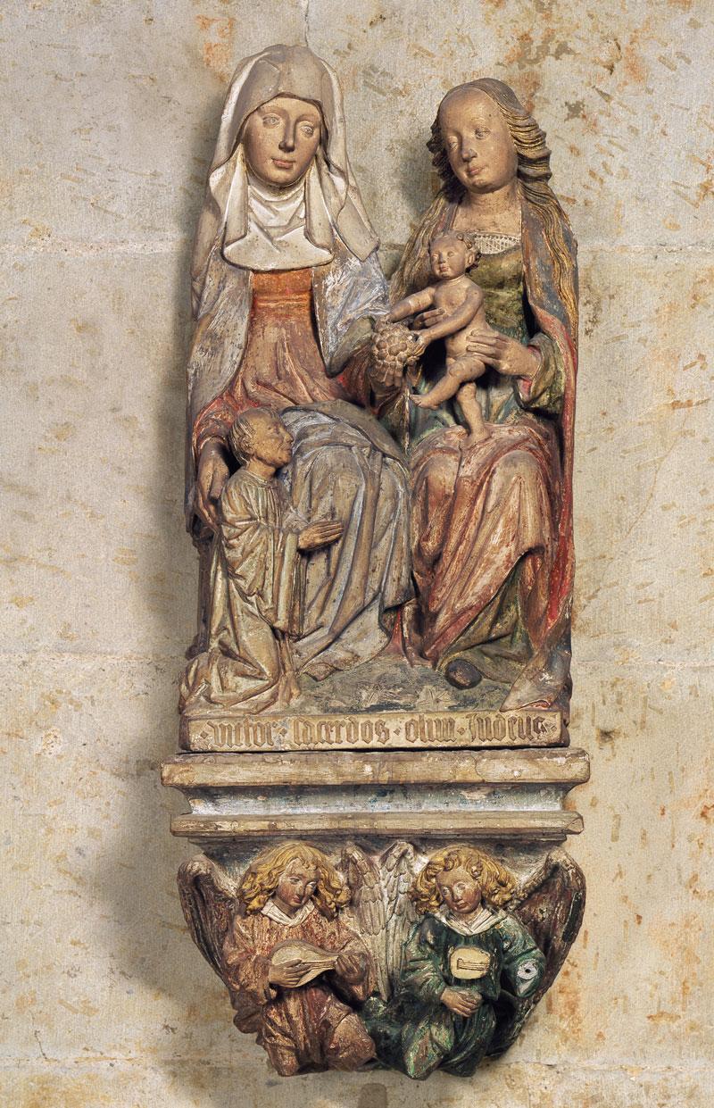 The donor appears twice in these groups: firstly, kneeing and praying at the feet of the Angel Gabriel in the Annunciation group and secondly, dressed as a cleric and facing towards Mary and the Christ Child in the Anna Selbdritt sculpture. In both cases, the donor is named in the inscription, which is repeated on the base of four of the five sculptures: 'Victor sacerdos olim Judeus' (the priest, Victor, former Jew).
