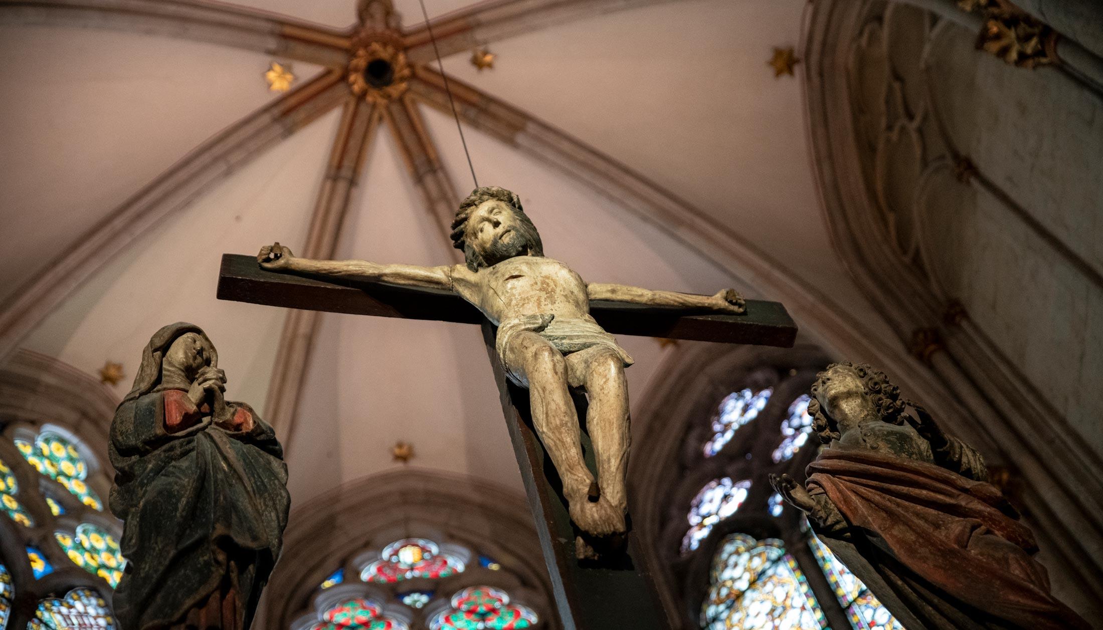 Vor dem Zweiten Weltkrieg gehörte die Kreuzigungsgruppe zur Orgel im Nordquerhaus. Entstanden ist die Gruppe im 16. Jahrhundert.