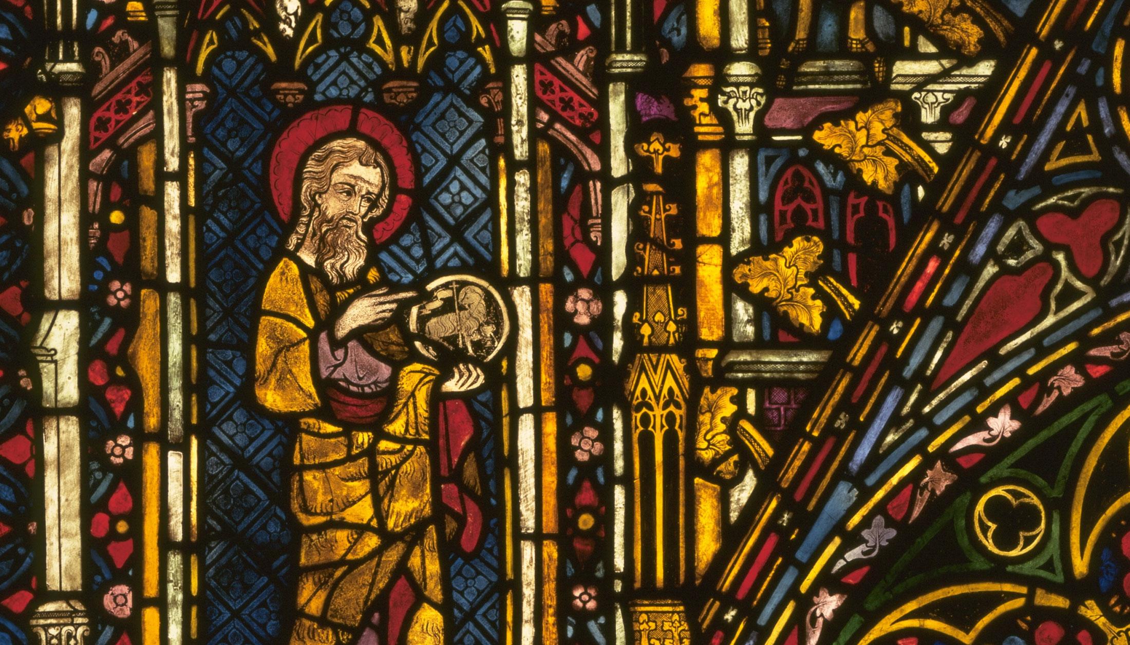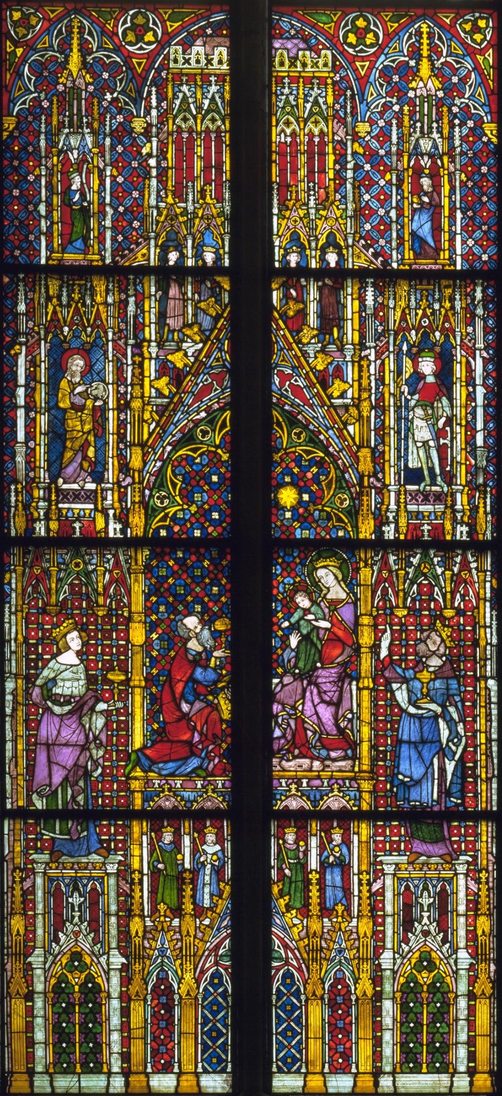 Das Fenster zeigt die Anbetung der Heiligen Drei Könige. Der älteste König kniet vor Maria und dem Kind und hält ihnen einen mit Goldmünzen gefüllten Pokal entgegen, die beiden anderen Könige stehen rechts und links des Mittelbildes.