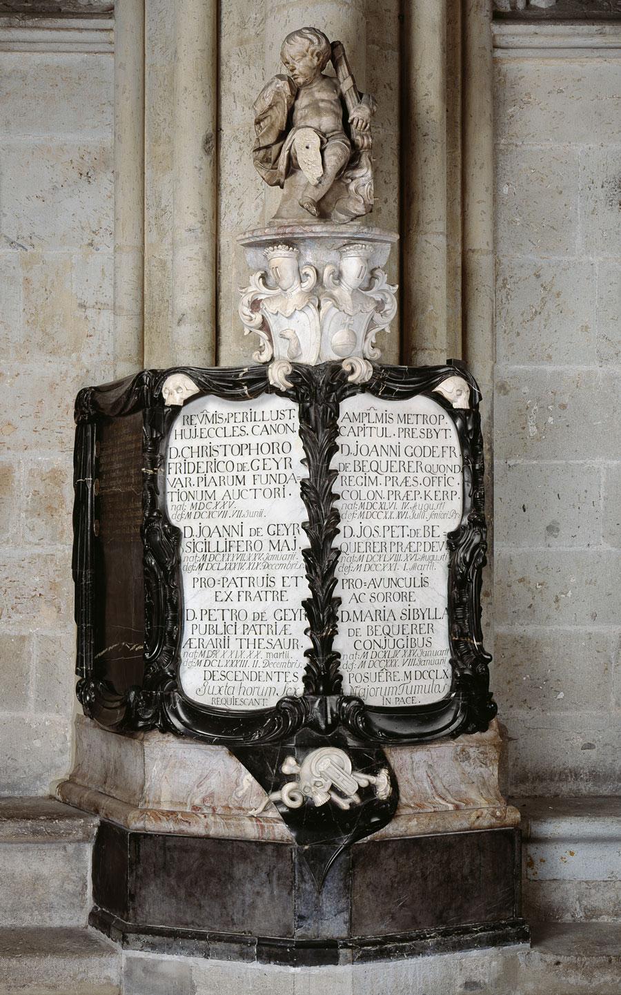 Drei große Schrifttafeln in einem kunstvoll geschweiften barocken Rahmen aus schwarzem Marmor umkleiden einen der Wandpfeiler in der Marienkapelle. Ihre Inschriften erinnern an verschiedene Mitglieder der Familien von Geyr, von Bequerer, von Plettenberg, von Kurtzrock und von Buschmann. Bekrönt wird das Epitaph von einer Konsole mit den Wappen von Geyr und von Bequerer, auf der seit 1991 ein nicht zugehöriger Alabasterputto mit einer gesenkten Fackel aufgestellt ist. Das am Sockel des Epitaphs befindliche, weiße Marmorrelief eines Totenschädels mit Schlange, Stundenglas und Sichel gemahnt auch hier an die Vergänglichkeit des menschlichen Lebens.