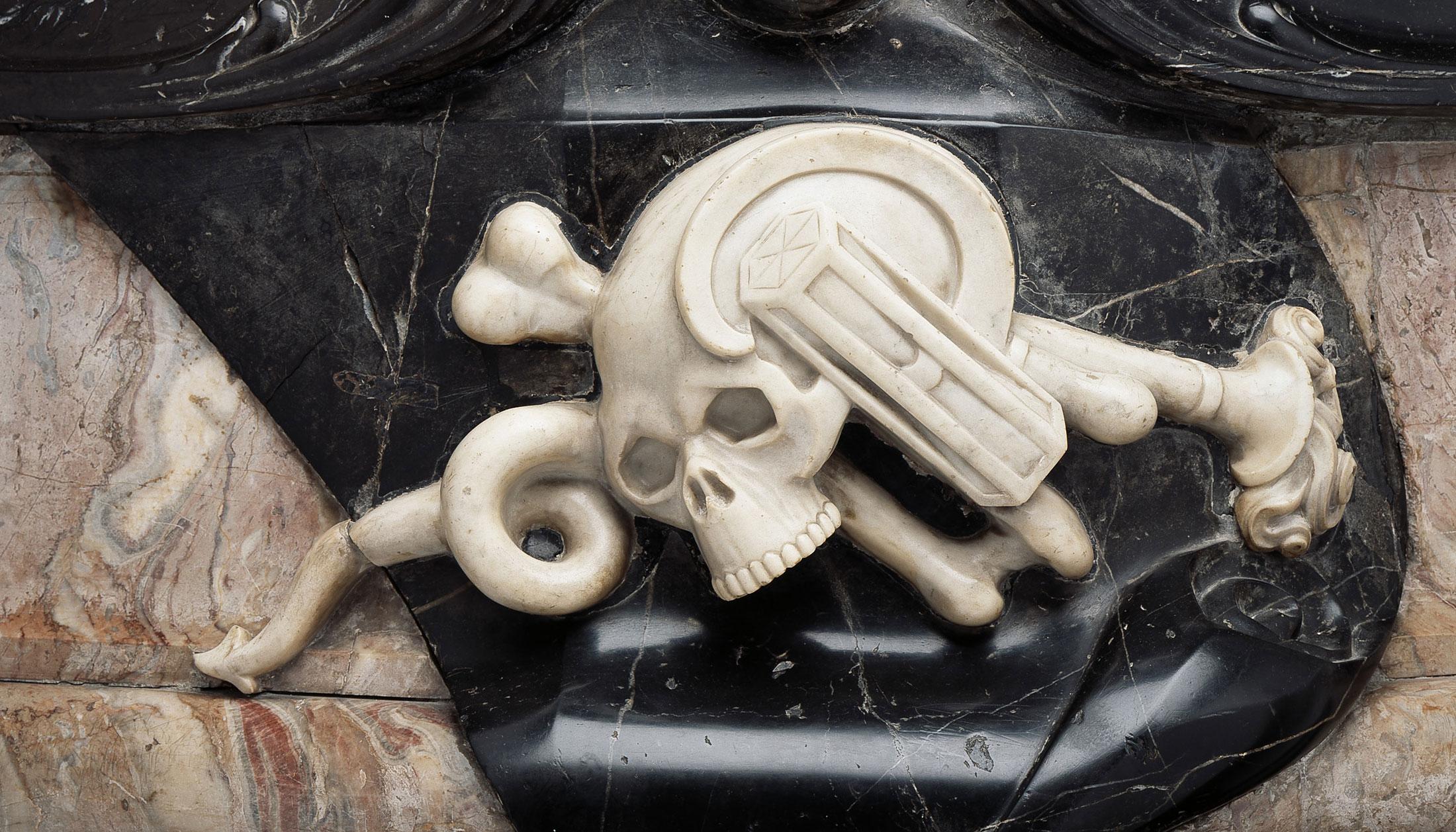 Drei große Schrifttafeln in einem kunstvoll geschweiften barocken Rahmen aus schwarzem Marmor umkleiden einen der Wandpfeiler in der Marienkapelle.