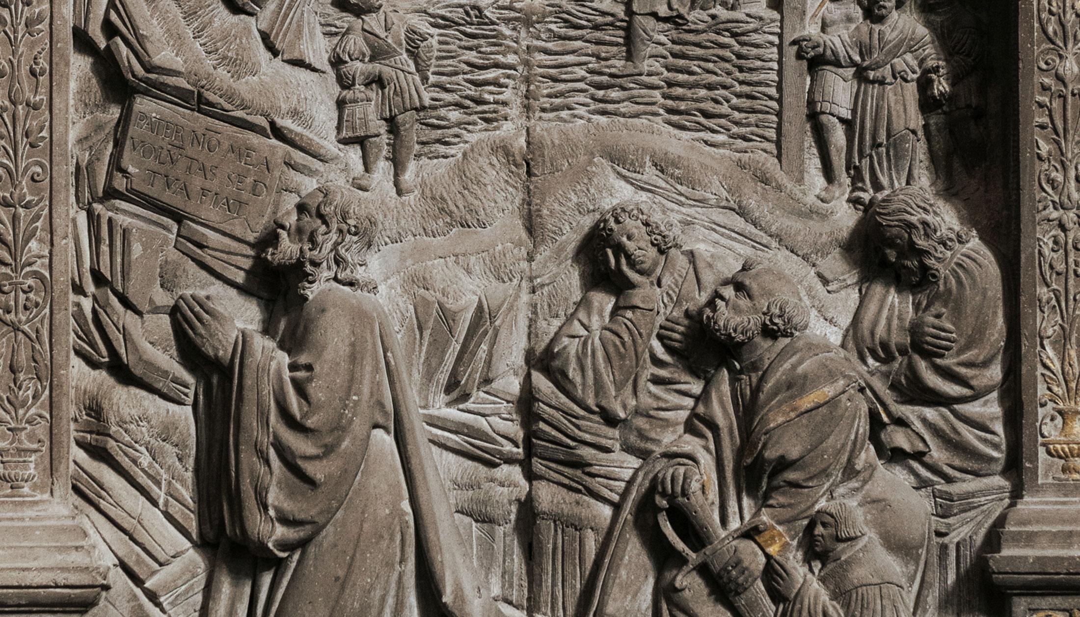 In einer architektonischen Renaissancerahmung zeigt das von Jacob Abel aus Köln geschaffene Tuffsteinepitaph des 1534 verstorbenen Domkapitulars Arnoldus Haldrenius unter einem Dreiecksgiebel mit eingepaßter Muschel eine Ölbergszene in flachem Relief.