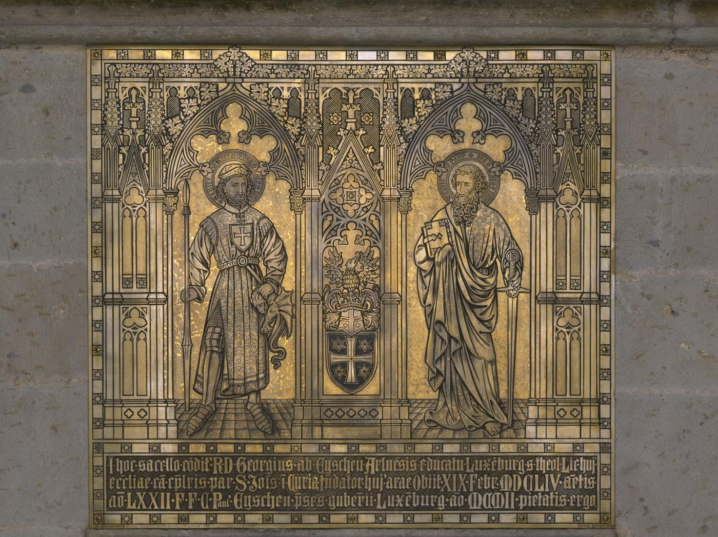 Sie ist eine Stiftung von seinem Nachfahren, dem Luxemburger Staatsminister Paul von Eyschen. Als Namenspatrone erscheinen der hl. Drachentöter Georg und der Apostel Paulus innerhalb einer reichen gotischen Architekturrahmung. Der Kölner Goldschmied Heinrich Birgel führte die Platte nach einem Entwurf von Wilhelm Mengelberg aus. Die Technik der Messinggravur, die in der Gotik häufig bei Grabplatten zur Anwendung kam, stellte einen Versuch zur Wiederbelebung dieser mittelalterlichen Kunstgattung dar.