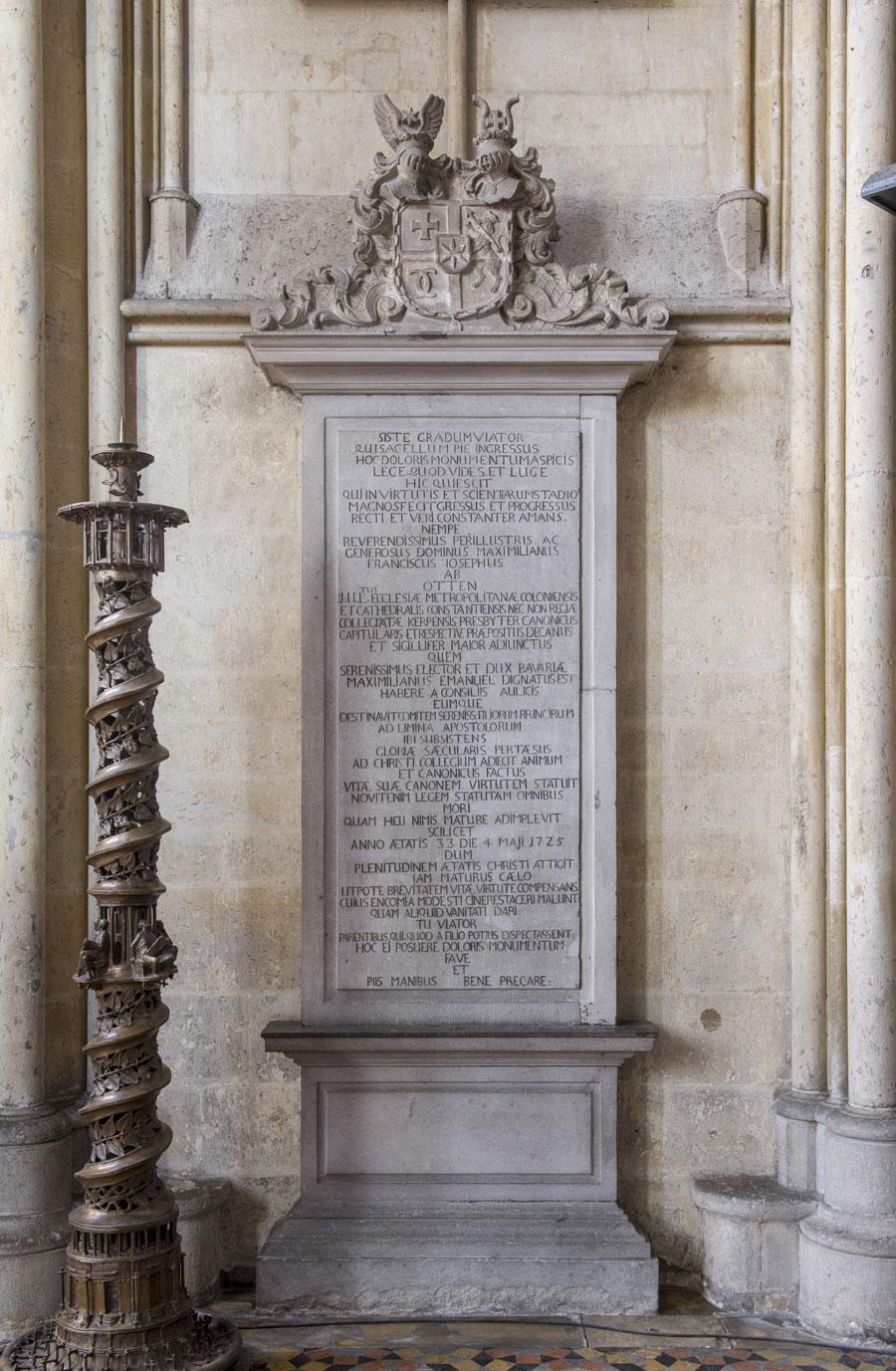 Das auffallend schlichte barocke Sandsteinepitaph des 1725 verstorbenen Domherrn Maximilian Franz Josef von Otten besteht aus einer schmalen hohen Inschriftentafel, die auf einem Sockel ruht.