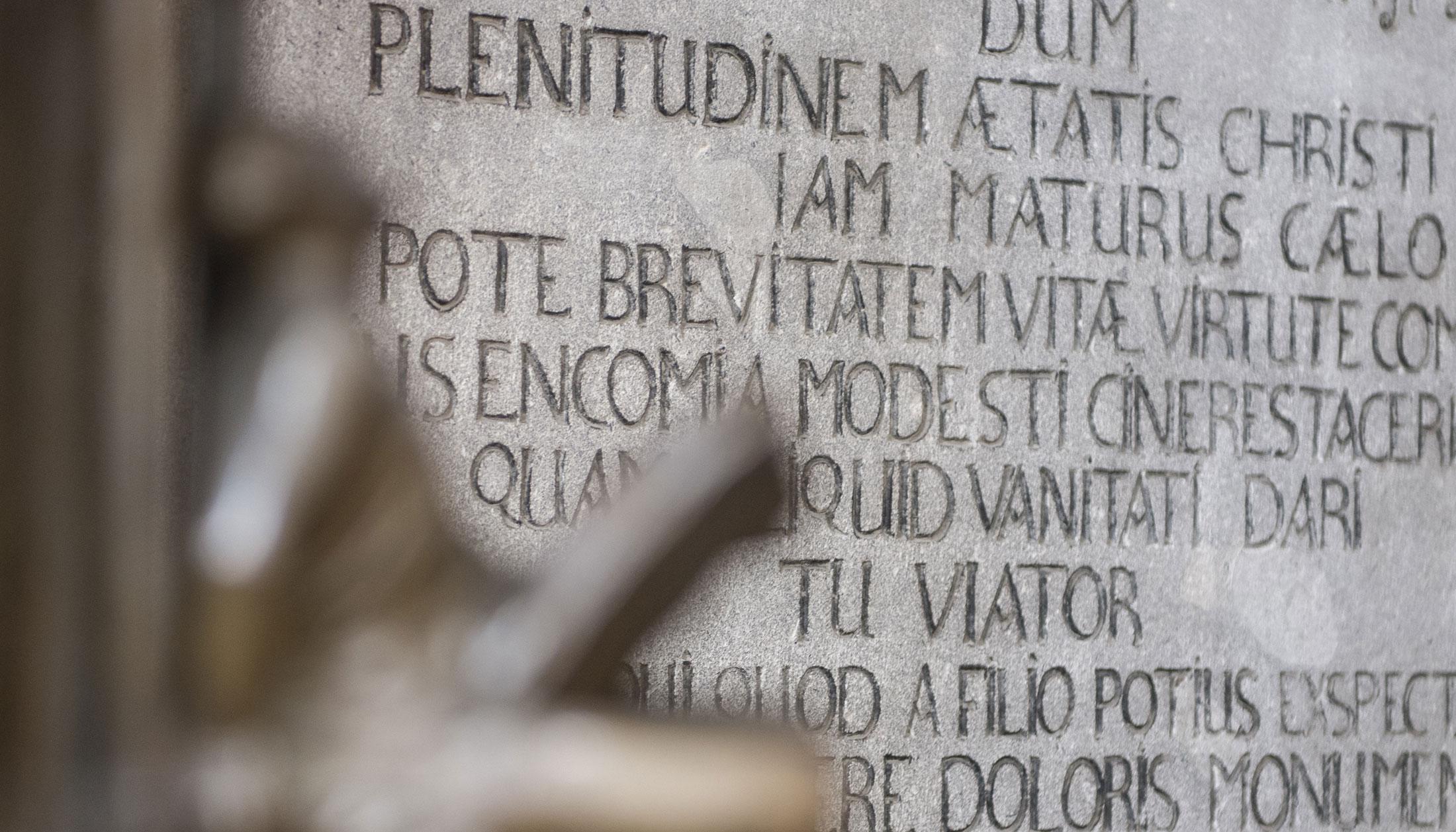 Auf ihr sind die verschiedenen Ämter und Würden des Verstorbenen verzeichnet. Sein reich geschmücktes Wappen ziert als Bekrönung die profilierte Deckplatte.