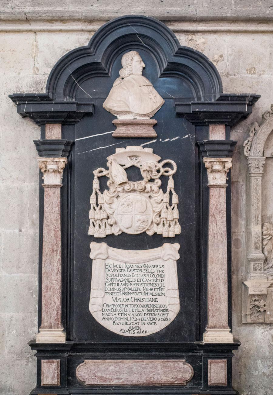 Seine leuchtend weißen Reliefs sind wirkungsvoll vor den dunklen Hintergrund aus schwarzem Marmor gesetzt. Ein Inschriftentuch nennt die verschiedenen Ämter und Titel des 1723 verstorbenen Kölner Weihbischofs Johann Werner von Veyder, dessen Wappen in einer mit Mitra und Bischofsstab verzierten Kartusche unter einem Bischofshut erscheint. Im zentralen Bogenfeld der Bekrönung ist eine plastisch hervortretende Porträtbüste zu sehen, die den Verstorbenen im Profil zeigt.