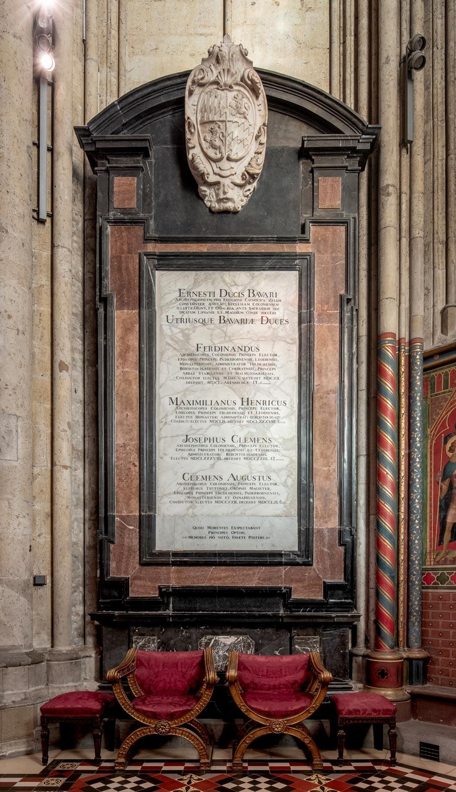 Dem Epitaph des Kurfürsten Ernst von Bayern im Aufbau der verschiedenfarbigen Marmorrahmung eng verwandt und diesem als Pendant gegenübergestellt ist die Gedenktafel für die fünf dem Hause Wittelsbach entstammenden Kurfürsten, die den Kölner Bischofsstuhl von 1583 bis 1761 innehatten und vor der Dreikönigenkapelle bestattet wurden. Name und Titel der Verstorbenen sind auf einer schlichten weißen Marmortafel festgehalten: Ernst (1583-1612), Ferdinand (1612-1650), Maximilian Heinrich (1650-1688), Josef Clemens (1688-1723) und Clemens August (1723-1761). Den geschweiften Giebel des epitaphartigen Aufbaus ziert das aus Alabaster gefertigte Wittelsbacher Wappen.