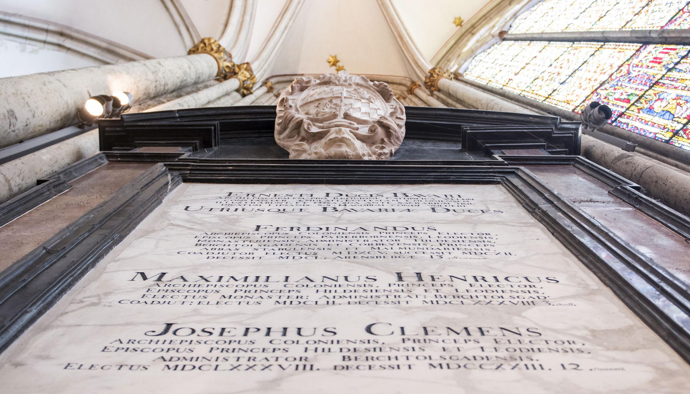 Dem Epitaph des Kurfürsten Ernst von Bayern im Aufbau der verschiedenfarbigen Marmorrahmung eng verwandt und diesem als Pendant gegenübergestellt ist die Gedenktafel für die fünf dem Hause Wittelsbach entstammenden Kurfürsten, die den Kölner Bischofsstuhl von 1583 bis 1761 innehatten und vor der Dreikönigenkapelle bestattet wurden.