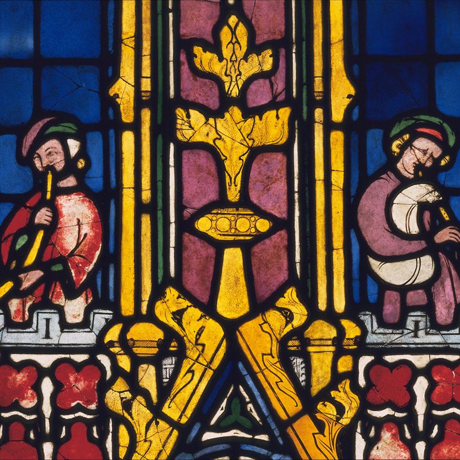 Ihre Namen sind in den Nimben zu lesen. Beide Heilige stehen unter einem reich verzierten gotischen Architekturbaldachin. An Konstruktionsdetails wird deutlich, daß die Entwerfer nicht nur die Domarchitektur kannten, sondern auch den Fassadenplan 'F', aus dem einige Motive übernommen wurden. In den Baldachinen stehen jeweils zwei Turmmusikanten, Schalmei- und Tamburinspieler, Dudelsackpfeifer und Hornbläser. Auf jedem Baldachin stehen zwei Engel, die den beiden Thebäern die Krone des Lebens entgegenhalten.