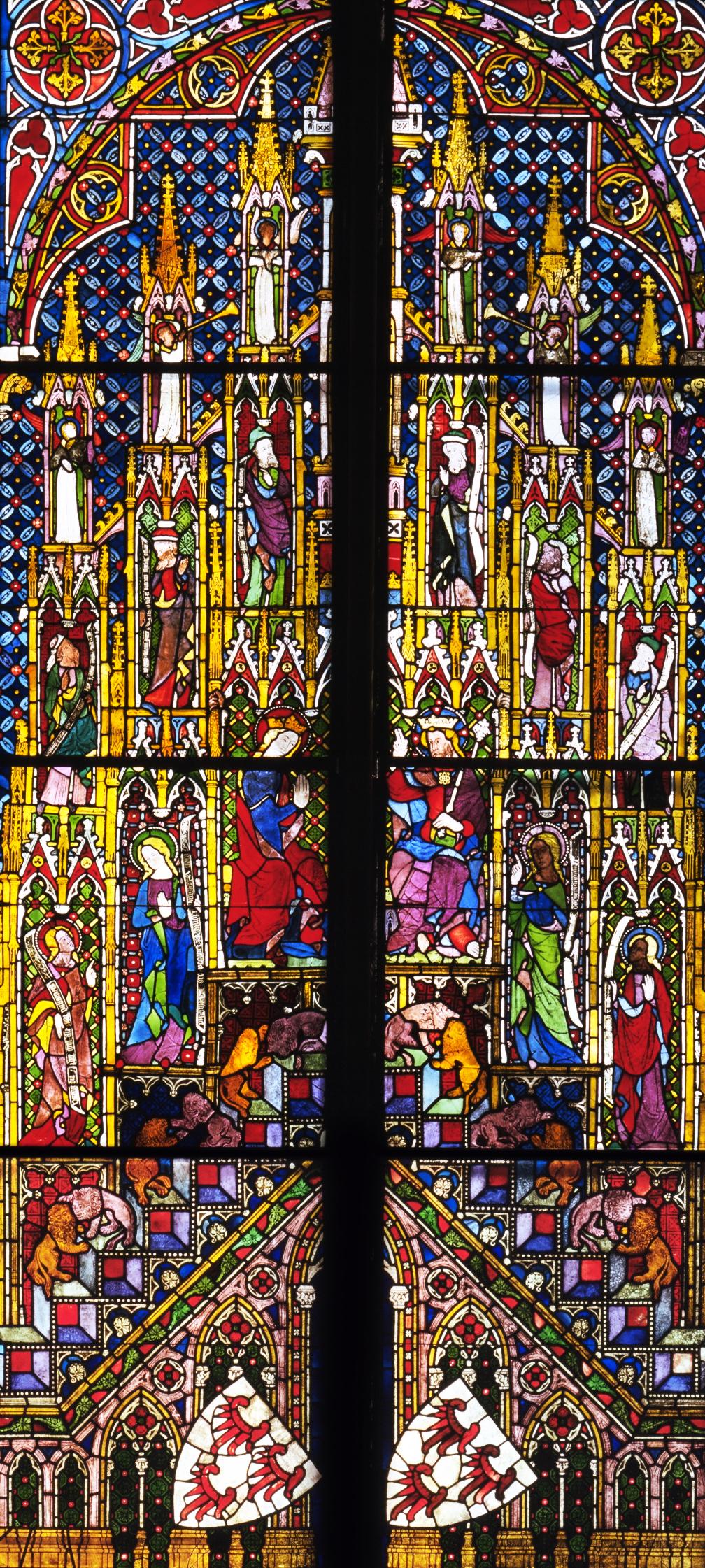 Auf einem siebenstufigen Unterbau erhebt sich das Mittelbild mit Christus und Maria, die gekrönt auf einer Thronbank sitzen. Sie verkörpern das himmlische Brautpaar ('sponsus und sponsa') aus dem Hohelied Salomos. Der Unterbau stellt den Thron Salomos dar, die zwölf Löwen auf den Stufen vertreten die Apostel. Die überaus reiche Rahmenarchitektur symbolisiert das himmlische Jerusalem. In den oberen Baldachinen stehen sechs Engel als Wächter der Himmelsstadt, darunter Propheten mit Spruchbändern. Die weiblichen Gestalten zu Seiten der Mittelszene verkörpern die Tugenden der Gottesmutter: Wahrhaftigkeit, Klugheit, Jungfräulichkeit und Demut.