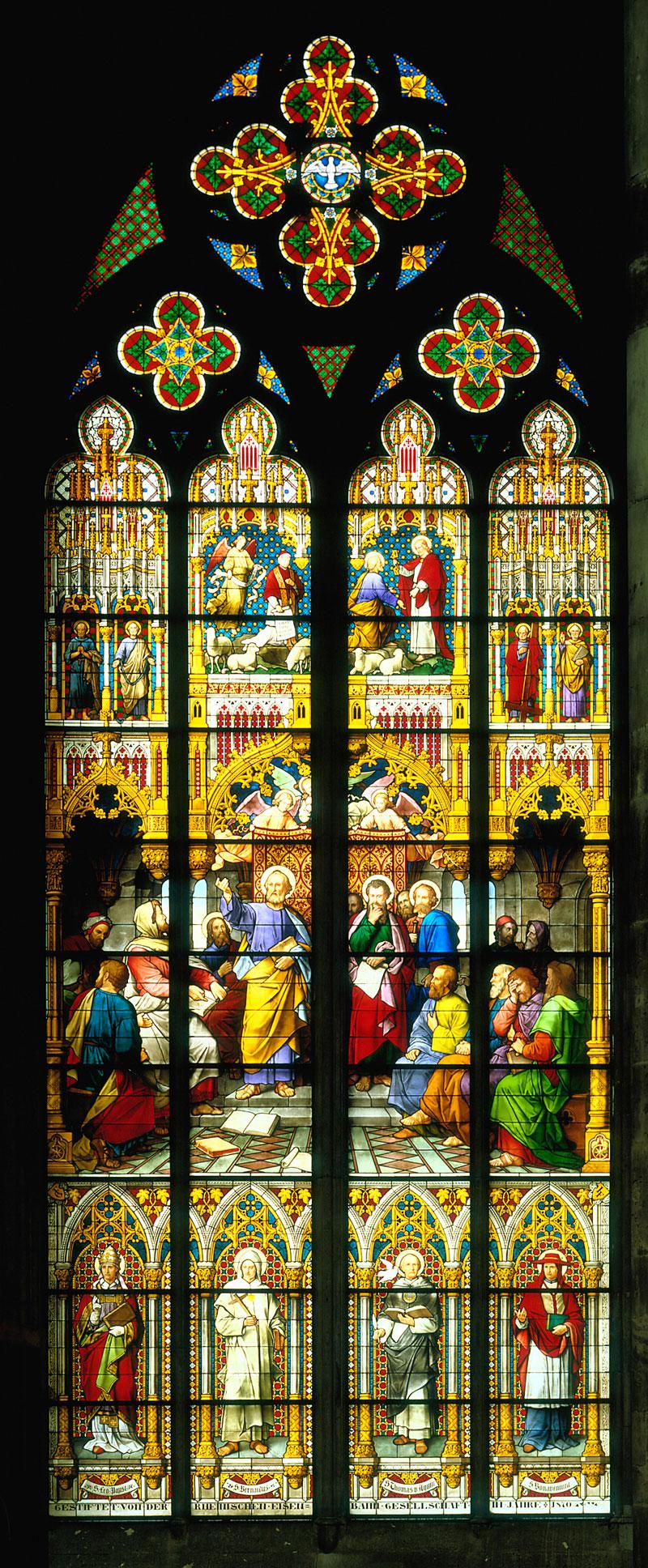 Das 1879 eingesetzte Petrusfenster wurde 1870 von der Rheinischen Eisenbahngesellschaft gestiftet und in der königlichen Glasmalereianstalt in München geschaffen.
