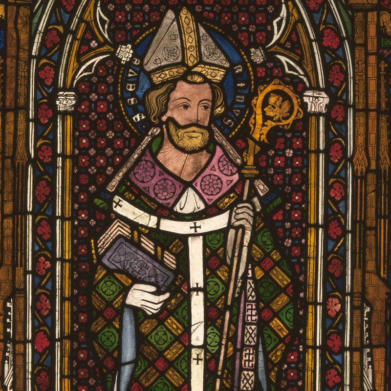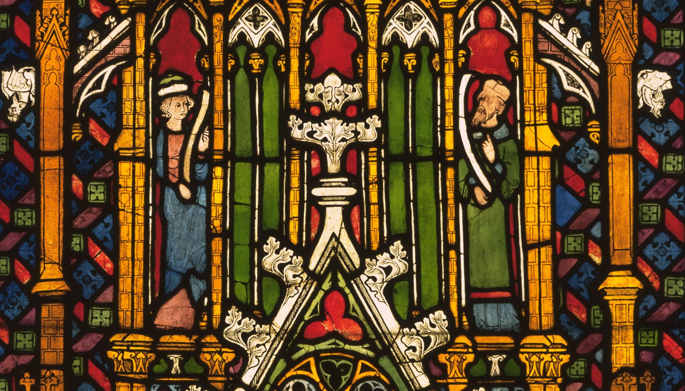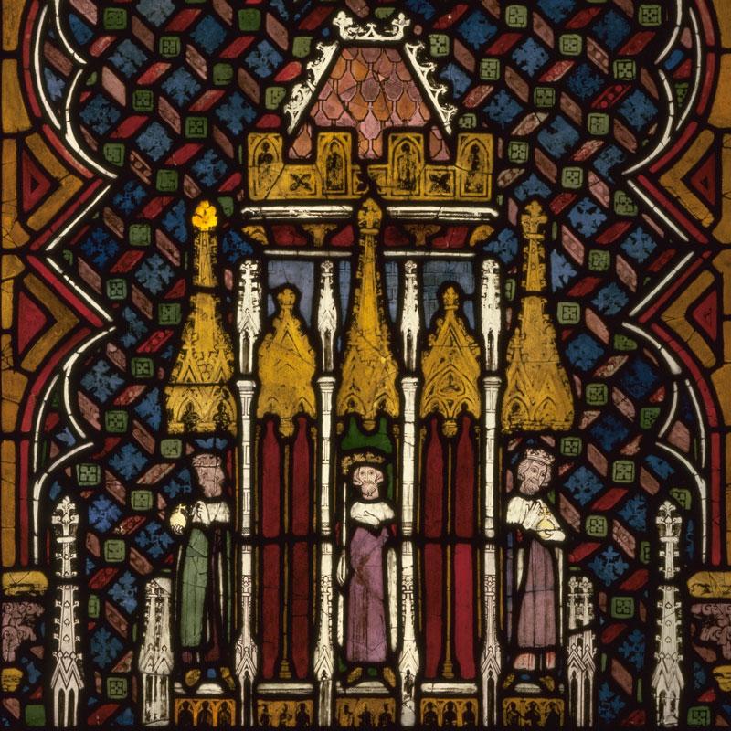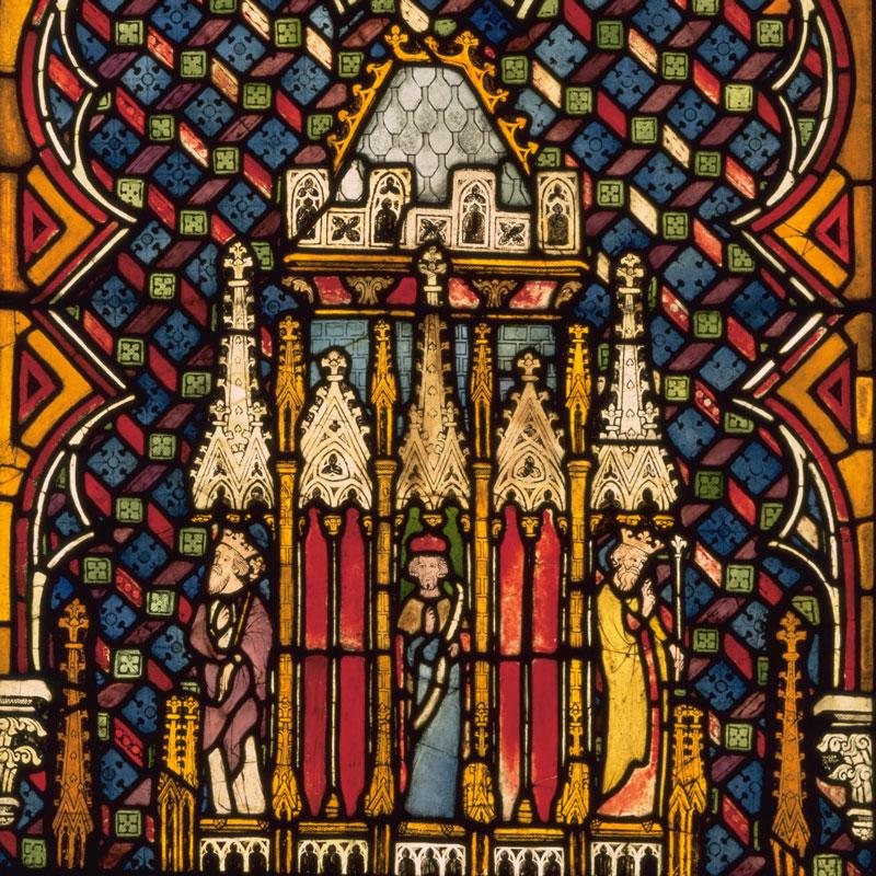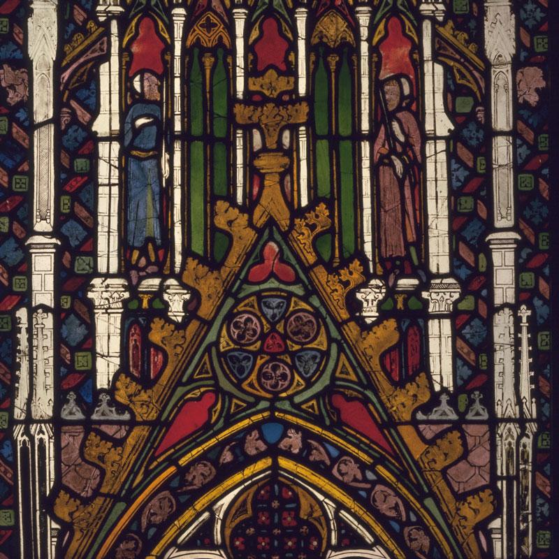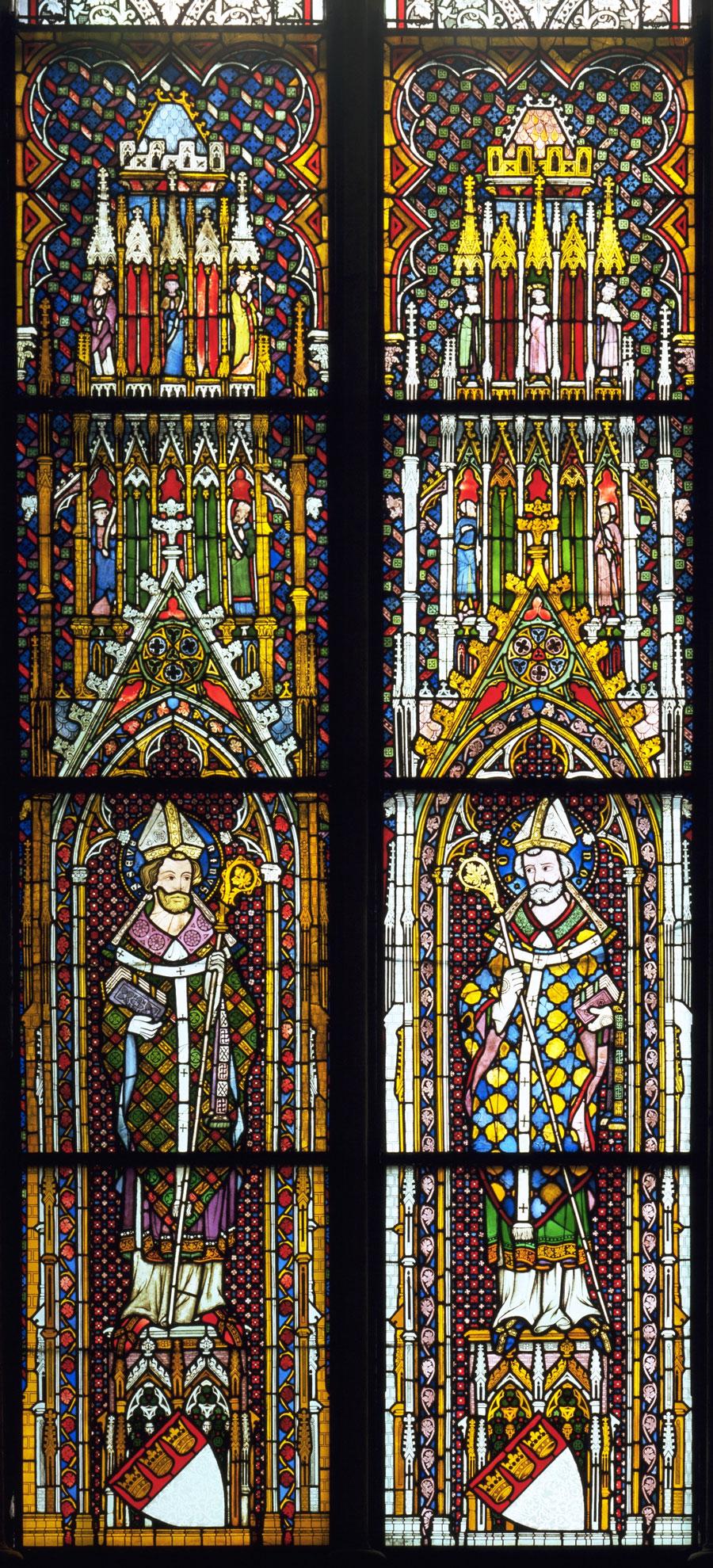 Beide Heilige stehen unter einem reich verzierten gotischen Architekturbaldachin. Die Rose im Wimperg belegt, daß die Entwerfer nicht nur die Domarchitektur kannten, sondern auch den Fassadenplan 'F', aus dem das Rosenmotiv wörtlich übernommen ist. Die kleinen Figuren in den Baldachinen stellen Könige und Ritter dar.